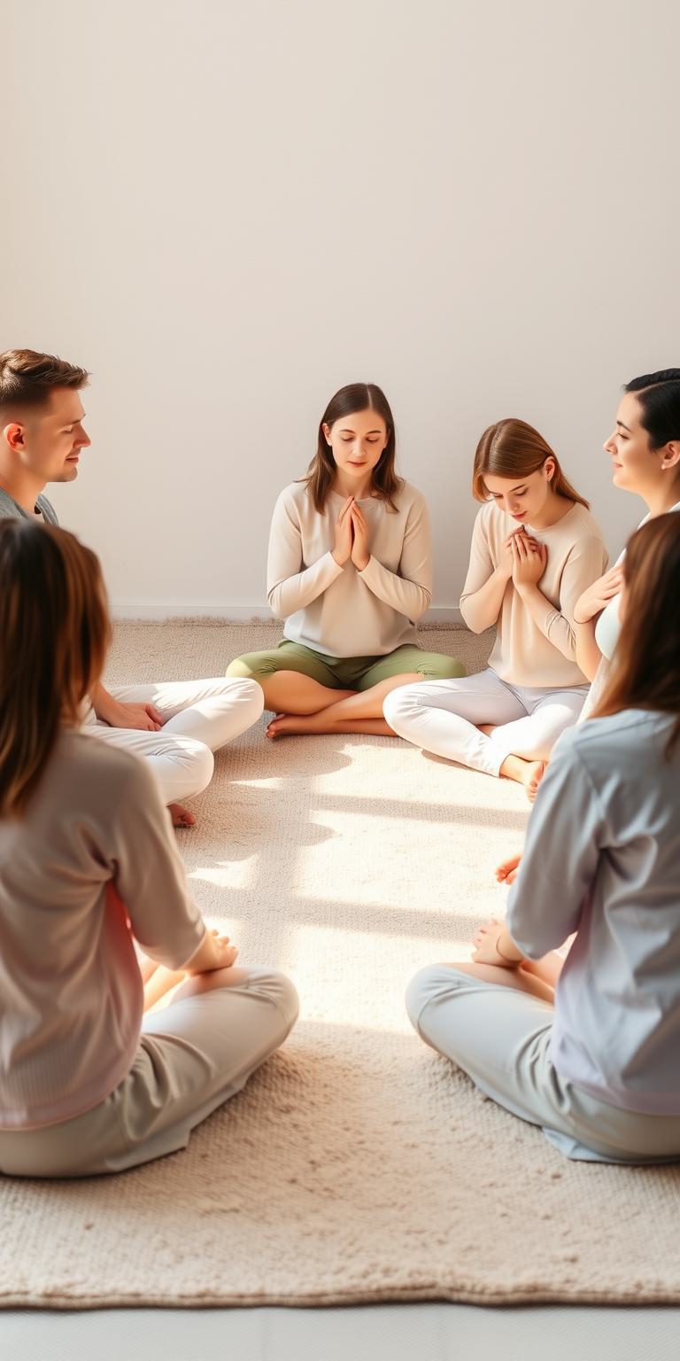 6-9 человек, русских, в расслабленных позах (сидят в кругу на ковре), глаза закрыты, руки на коленях или сложены на груди., Мягкий естественный свет , легкие тени. Теплые пастельные тона: лаванда, кремовый, светло-оранжевый, мягкий золотистый, приглушенный зеленый., Фон: нейтральная мягкая текстура, Плавные линии, напоминающие дыхание или энергию (волны, лучи света), в теплых тонах., Элементы природы: листья, капли воды, солнечные блики.