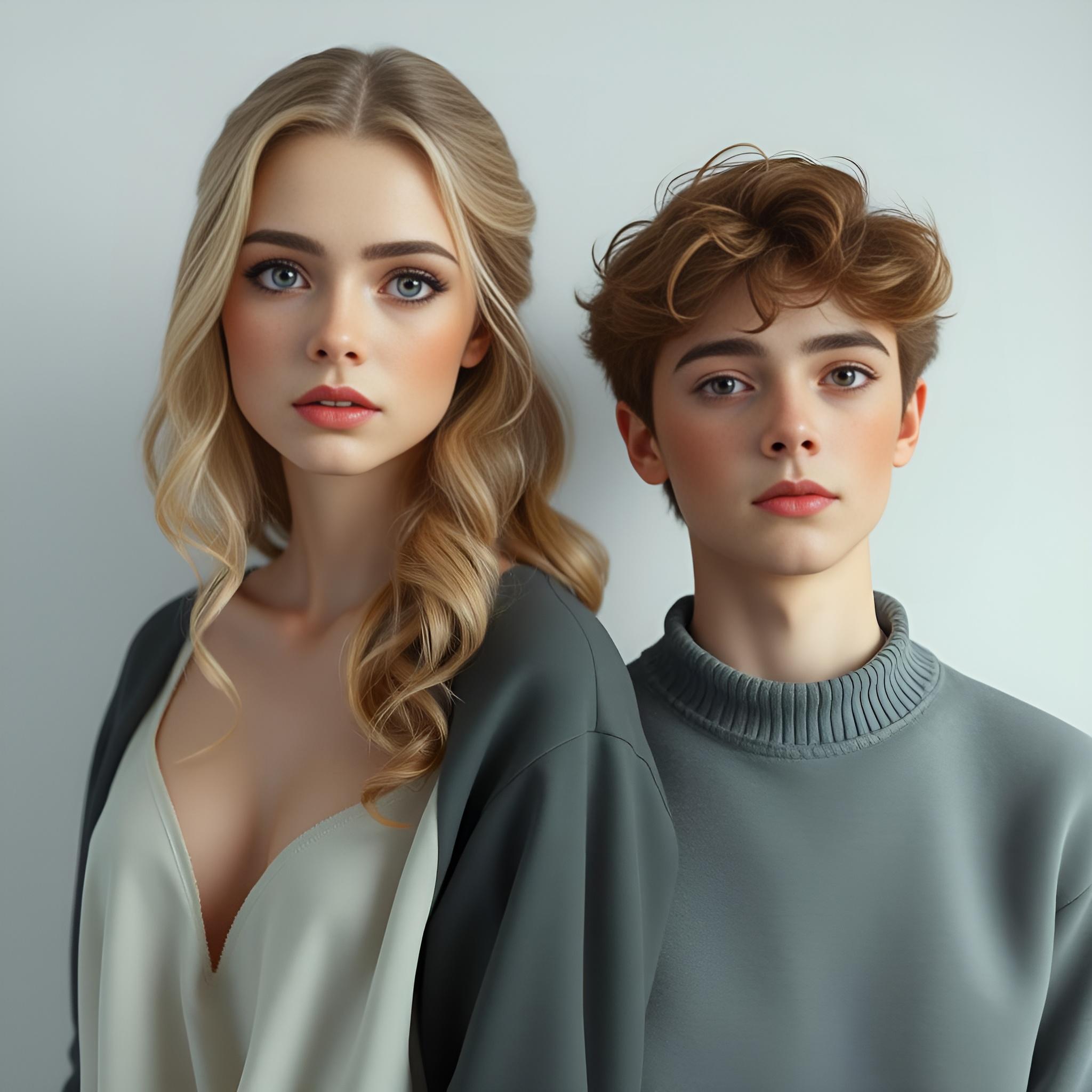 1. Кристи:, • Описание: 18-летняя девушка с нежными чертами лица, большими выразительными глазами, светлыми волнистыми или прямыми волосами., • Стиль: Пастельные тона в одежде, мягкий и спокойный образ, лёгкая нотка грусти и задумчивости., 2. Крис:, • Описание: 18-летний молодой человек с более резкими чертами лица, тёмными волосами и интенсивным взглядом., • Стиль: Тёмные оттенки в одежде, лаконичный и строгий образ, подчёркивающий защитную и сильную натуру., 3. Общий фон:, • Атмосфера: Контраст между мягкостью Кристи и защитной натурой Криса, возможно, лёгкий сумеречный фон, подчёркивающий их внутренний мир.