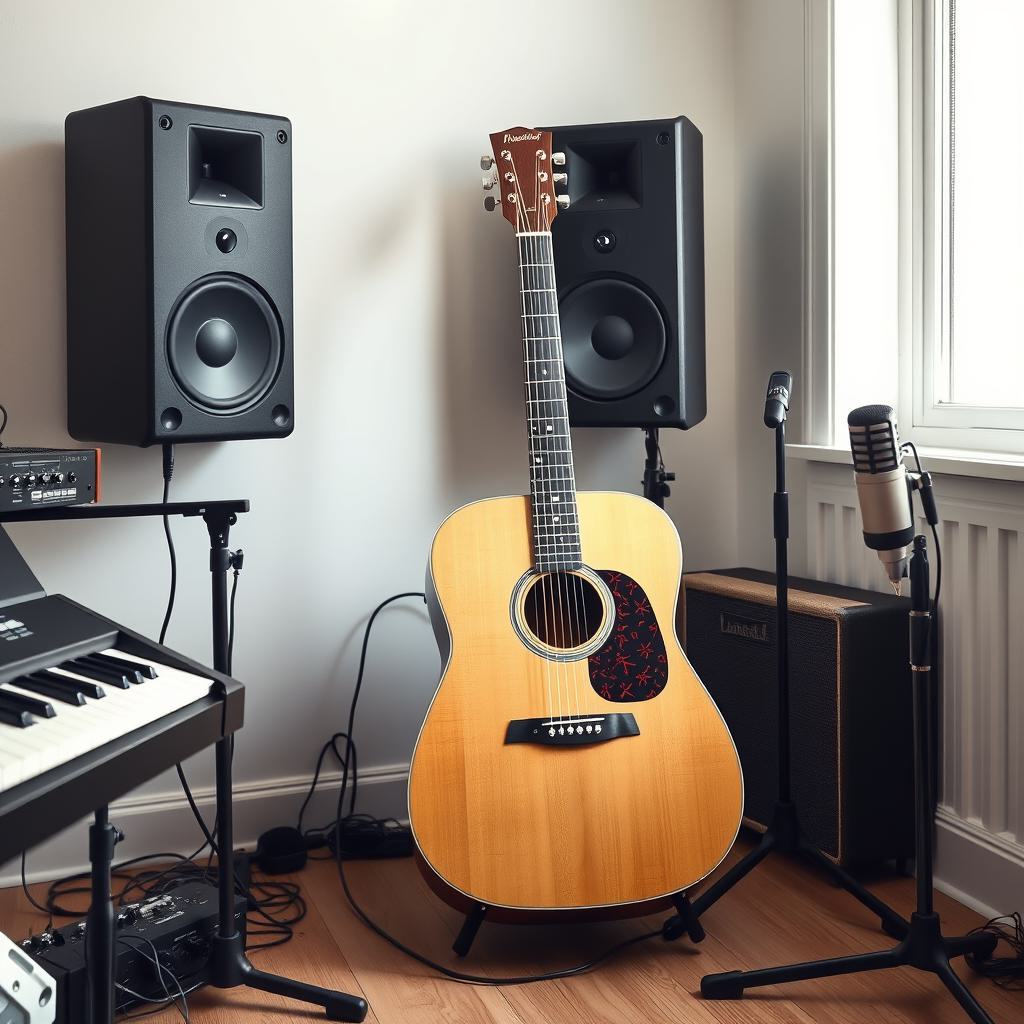 красивая акустическая гитара рядом с синтезатором и микрофоном в светлом помещении