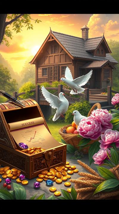 A detailed digital painting of a magical sunrise garden. Foreground: ornate chest spilling gold coins and gems (wealth), scroll with upward graph and pen (success), basket of fruit and wheat (well-being). Center: two white doves and pink peonies (love). Background: wooden bridge, prosperous house, red-crowned crane flying (luck). Style: fantasy realism, warm golden light, cinematic, serene atmosphere. 4K resolution.