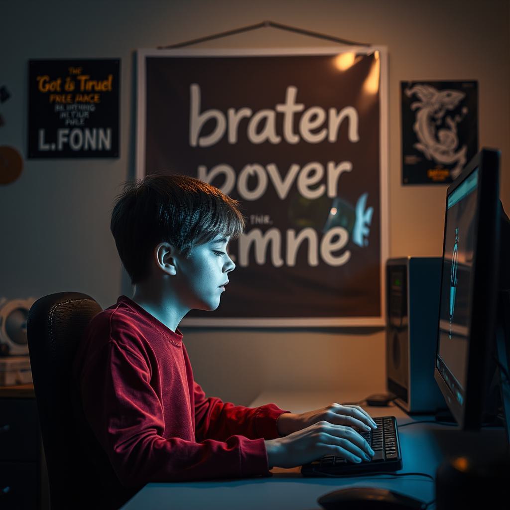 Мальчик за компьютером, сзади на стене висит плакат с надписью Bratan.pover.mne