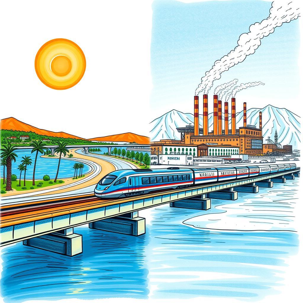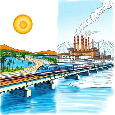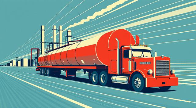 Плакат в стиле советского конструктивизма 1920-х годов. Динамичная геометрическая композиция. Стилизованный промышленный комплекс: смелый красный седельный тягач с цилиндрической цистерной-прицепом, перевозящий схематичный завод с ректификационными колоннами и трубопроводами. Диагональные линии и пересекающиеся геометрические формы создают движение. Ограниченная палитра: красный, черный, электрический синий и кремовый. Синий цвет используется как современный неоновый акцент, очерчивающий структурные элементы. Плоские цвета, строгая типографика, асимметричная компоновка. Без текста и читаемых букв.