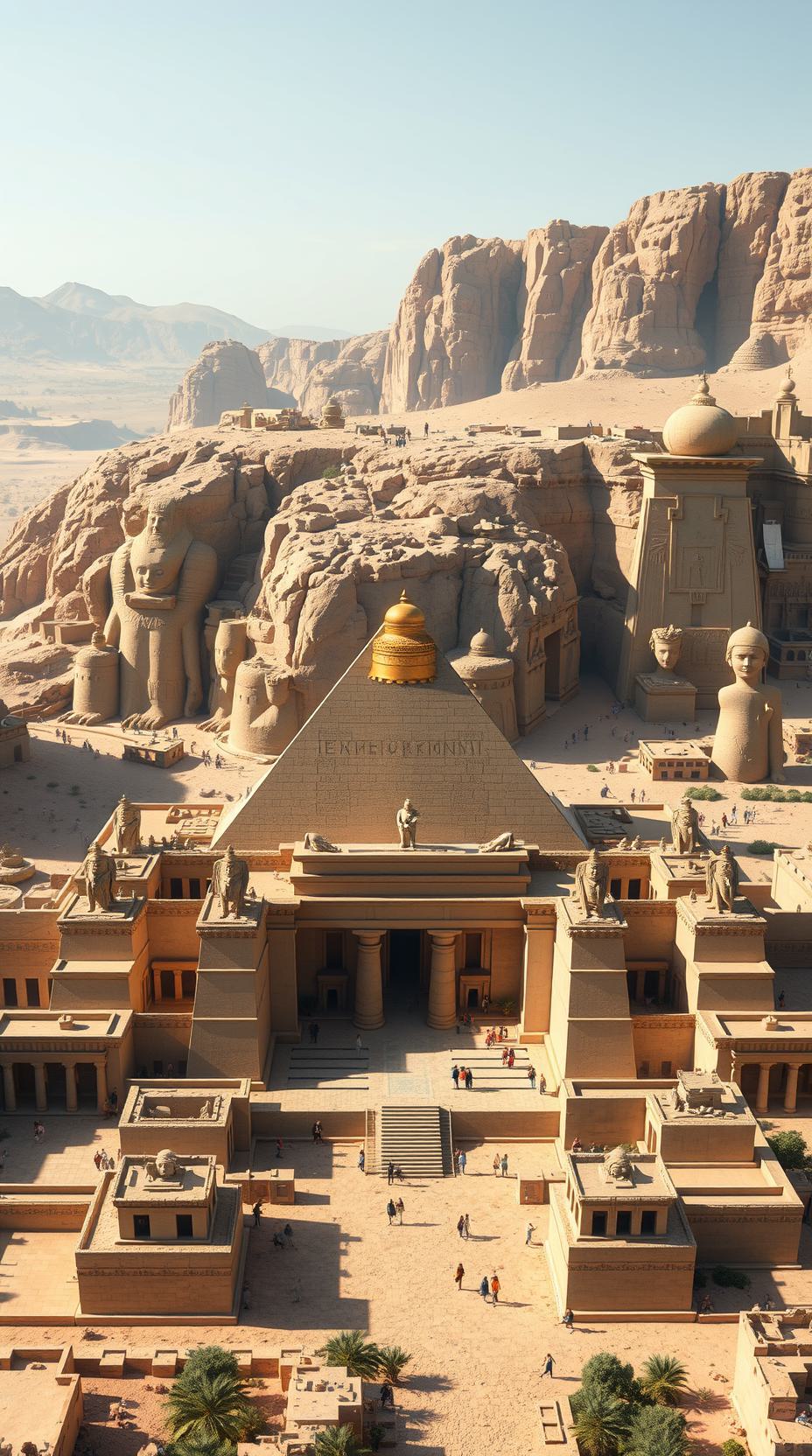 Древнеегипетский город с большой белой пирамидой с золотой вершиной, окружённый симметричными храмами и постройками из песчаника, расположены в шахматном виде, здание посередине с более прямой крышой, а на крыше по обе стороны расположены статуи,в пустынной долине с высокими скалами и гигантскими статуями фараонов, вырезанными в скале, кинематографическое освещение, фэнтезийная атмосфера, высокая детализация, приглушенный цвет, кадр прямой, коты, сфинкс на фоне Гиза, абу Темпле , Карнак