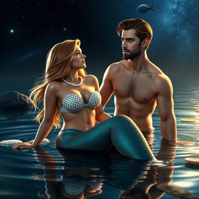 Ослепительно красивая русалка сидит в пруду, на ней лифчик из жемчужин, Она разговаривает с красивым мужчиной 40 лет, у него русые волосы и голубые глаза, он ведьмак, звёздное небо отражается в воде, сказочный вечер