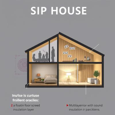На изображении показан современный SIP-дом в разрезе. Снаружи — условные знаки шума: машины, люди. Внутри — полная тишина, подчеркнутая иконками "zzz" и умиротворенной атмосферой. Схематично выделены ключевые элементы: плавающая стяжка пола с звукоизоляционной прослойкой, многослойные перегородки с минватой и подвесной акустический потолок. Всё это создает идеальную звукоизоляцию между этажами и комнатами.,