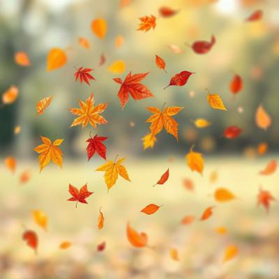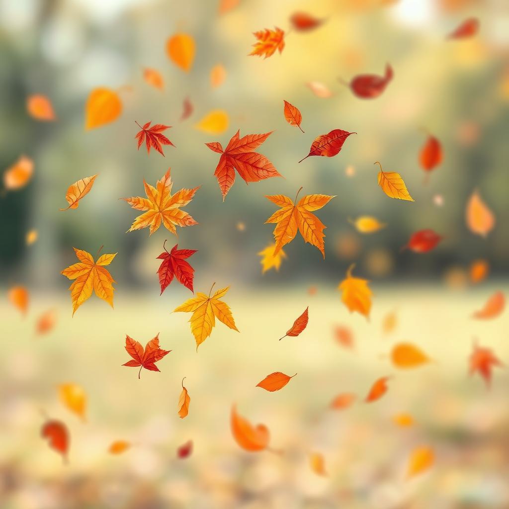 Изобрази осеннюю сцену с падающими листьями на размытом фоне. Фон должен быть мягким, как будто размытым объективом. Листья разных осенних цветов (красные, оранжевые, жёлтые) летят по ветру, создавая красивый хаотичный узор. Добавь в изображение немного света и тени, чтобы создать объем и глубину, подчеркивая красоту осени и надписи