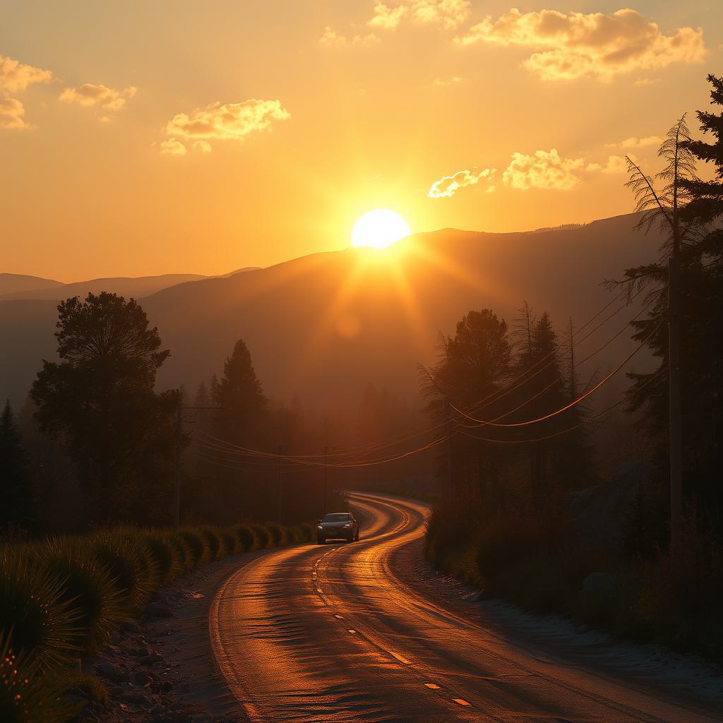 На переднем плане изображена "огненная лошадь" с яркой, пылающей гривой и длинным хвостом. Она стоит на зелёном лугу, окружённом цветущими деревьями и яркими цветами. На заднем плане виднеются горы, отражающие тёплые оттенки солнечного света.