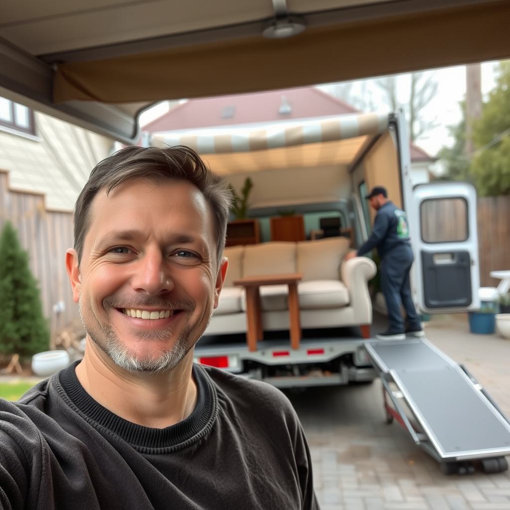 На переднем плане - улыбающийся мужчина на втором плане - погрузка дивана, стола, стульев двумя грузчиками во дворе города Набережные Челны на мелкотоннажном тентованном грузовике