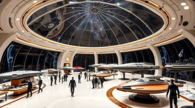 Теплая картинка. Величественный салон по продаже звездолетов. Полы белые и в золоте, много выставочных звездолетов разных цветов в зале. вокруг ходят много инопланетян. 50 метров от Пола начинается потолок из стеклянных плит, через который виден черный космос с яркими звездами. у стены на хрустальной сцене стоит на полу - главный экспонат - ярко красный сверкающий большой звездолет-истребитель -демонстрационная модель с открытым боковым люком