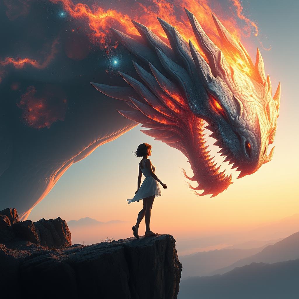 Девушка с короткими волосами стоит на обрыве протягивает руку вперед к голове космического дракона вокруг них космос и пламя