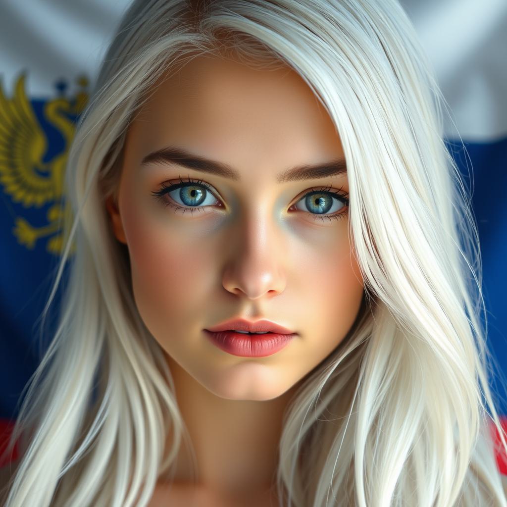 сненерируй картинку .Девушка с длинными белыми волосами , серо-голубыми глазами , тонкими чертами лица , пухлыми губами , маленьким носом . на фоне флаг России