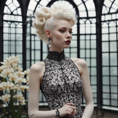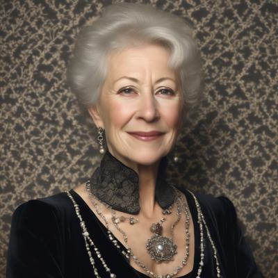 Photo of an elderly woman very similar to Helen Mirren, 1884, charming, energetic, calm, perfect symmetrical gray eyes, focused face,, very short gray hair, beauty in vintage dress, black velvet dress coat,, necklace, background vintage library, fractal pattern on dress, diffused lighting,, sharp focus, center of frame, photographer Frank S. Bangs, high resolution, HDR