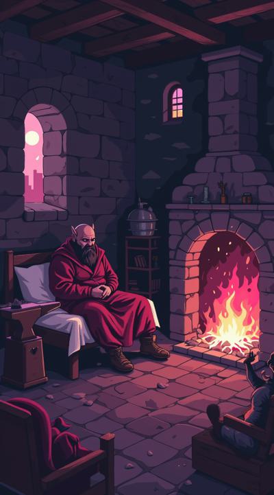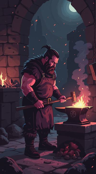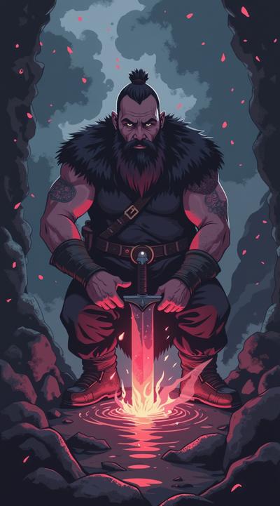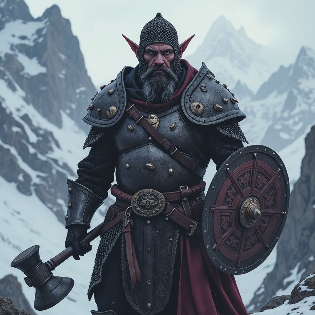 Изобразите дварфа-жреца бури в тяжёлой кольчужной броне с глубокими резными узорами, вдохновлёнными природной стихией. руках персонаж уверенно держит тяжёлый железный молот с зазубренной поверхностью и небольшой щит, покрытого старинными рунами силы и защиты. Из-за спины дварфа виднеются высокие горные хребты, погружённые в темноту шторма. Над головой сверкает яркая молния, создавая атмосферу напряжённости и могущества божественного покровительства. Лысый, седой, длинная густая борода дварфа слегка растрепаны порывистым ветром, символизируя связь героя с силой природы.