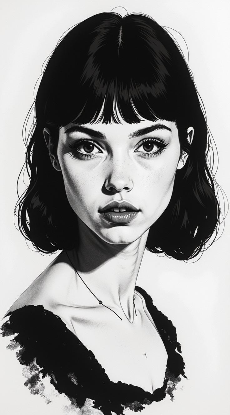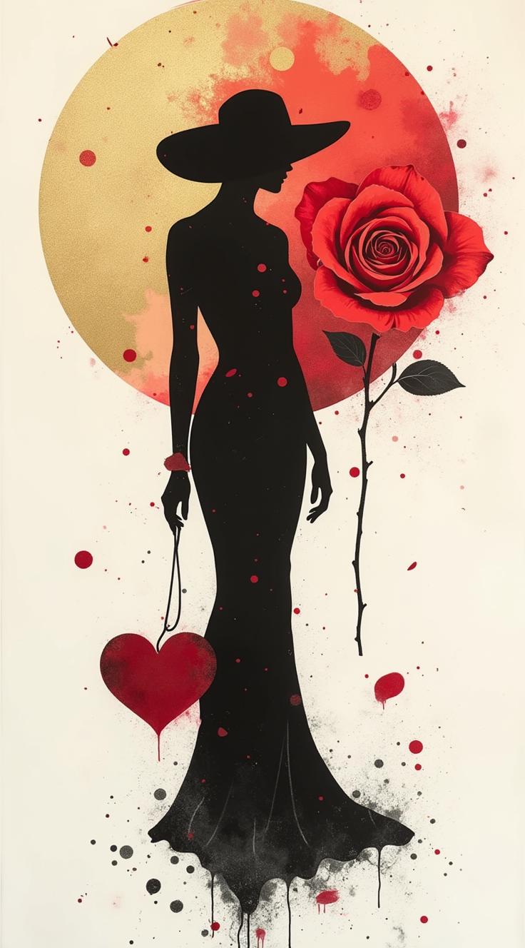 В стиле Рене Грюо,Дэвид Даунтон и Павел Гузенко,рисуют,уголь,гуашь и акрил,чёрное на белом и алый gold.Стиль простота и образность,недосказанность и полунамёк,элегантность, шик.Отдельными мазками сухой кисти,локальные пятна и брызги.Элегантная дама в широкополой шляпе и розой в виде сердца.Пастельным и оттенками сочетаются со смелыми черно-белыми и черно-алыми тонами.Стилистика Pebble art от Christian Diоr.HD ultra,5D,8k