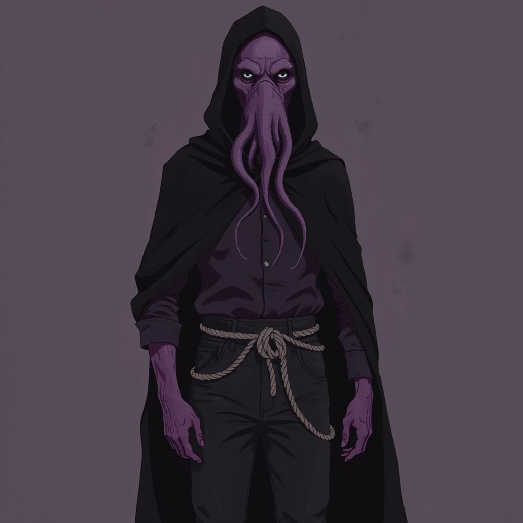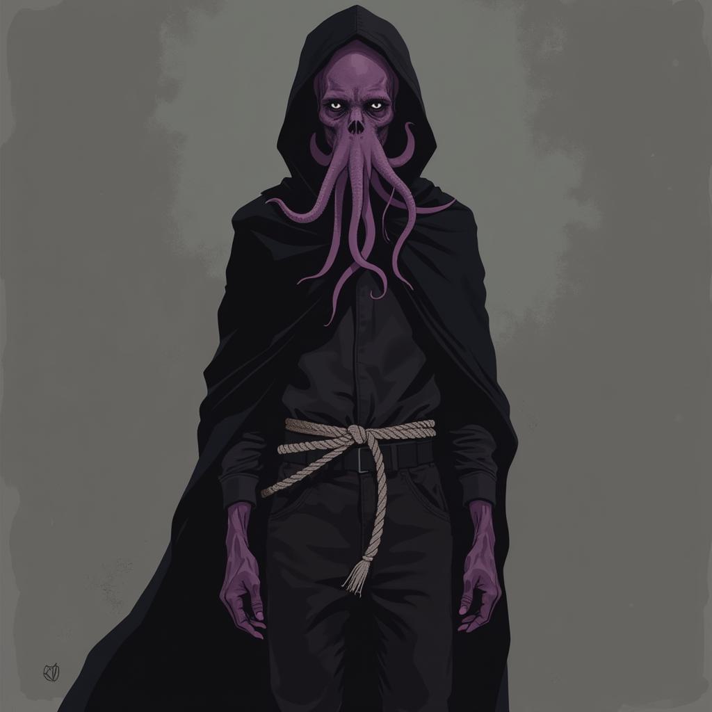 Антропоморфное, человекоподобное худое существо похожее на Ктулху с тёмно-фиолетовой кожей, молодое человеческое лицо с четырьмя щупальцами над ртом, одет в Тёмную одежду с капюшоном и длинными глубокими рукавами, чёрный длинный плащ и тёмные штаны, пояс в виде верёвки, нет левой руки, из левого плеча растут четыре щупальца длинной достающих до коленей
