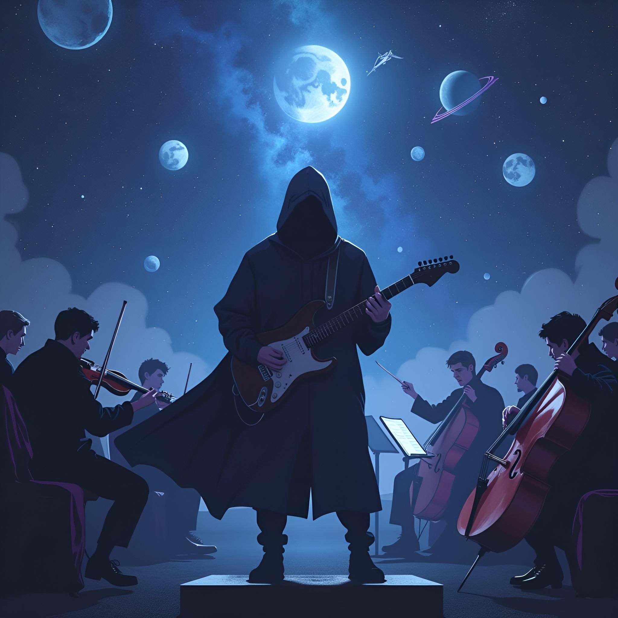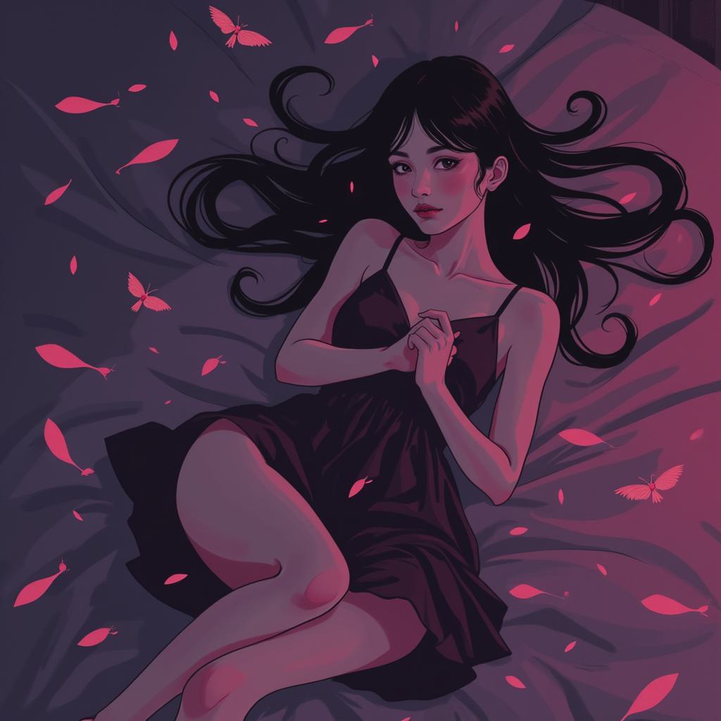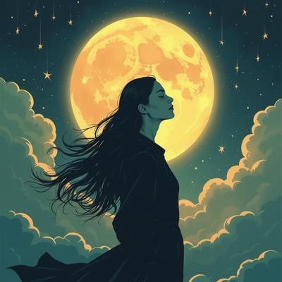 Нежная девушка с закрытыми глазами стоит среди мягких золотистых облаков. Её длинные тёмные волосы развеваются на ветру и переливаются сине-зелёными оттенками. За её спиной — большое тёплое жёлтое лунное сияние. Ночное небо усыпано маленькими звёздами, некоторые из них висят на тонких светящихся нитях. Атмосфера — магическая, спокойная, с лёгким сказочным настроением. Стиль — мягкая цифровая иллюстрация, плавные линии, тёплая палитра, художественная детальность.