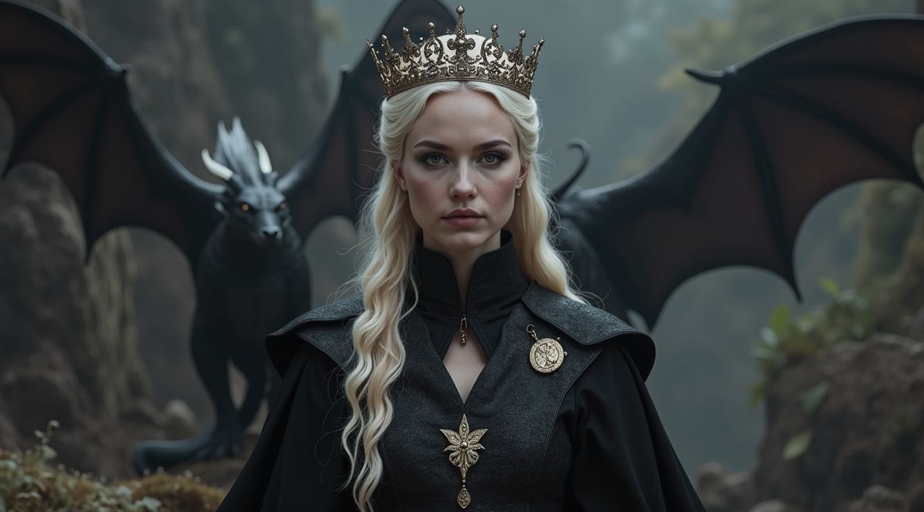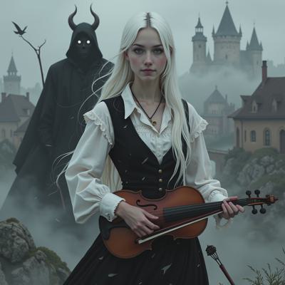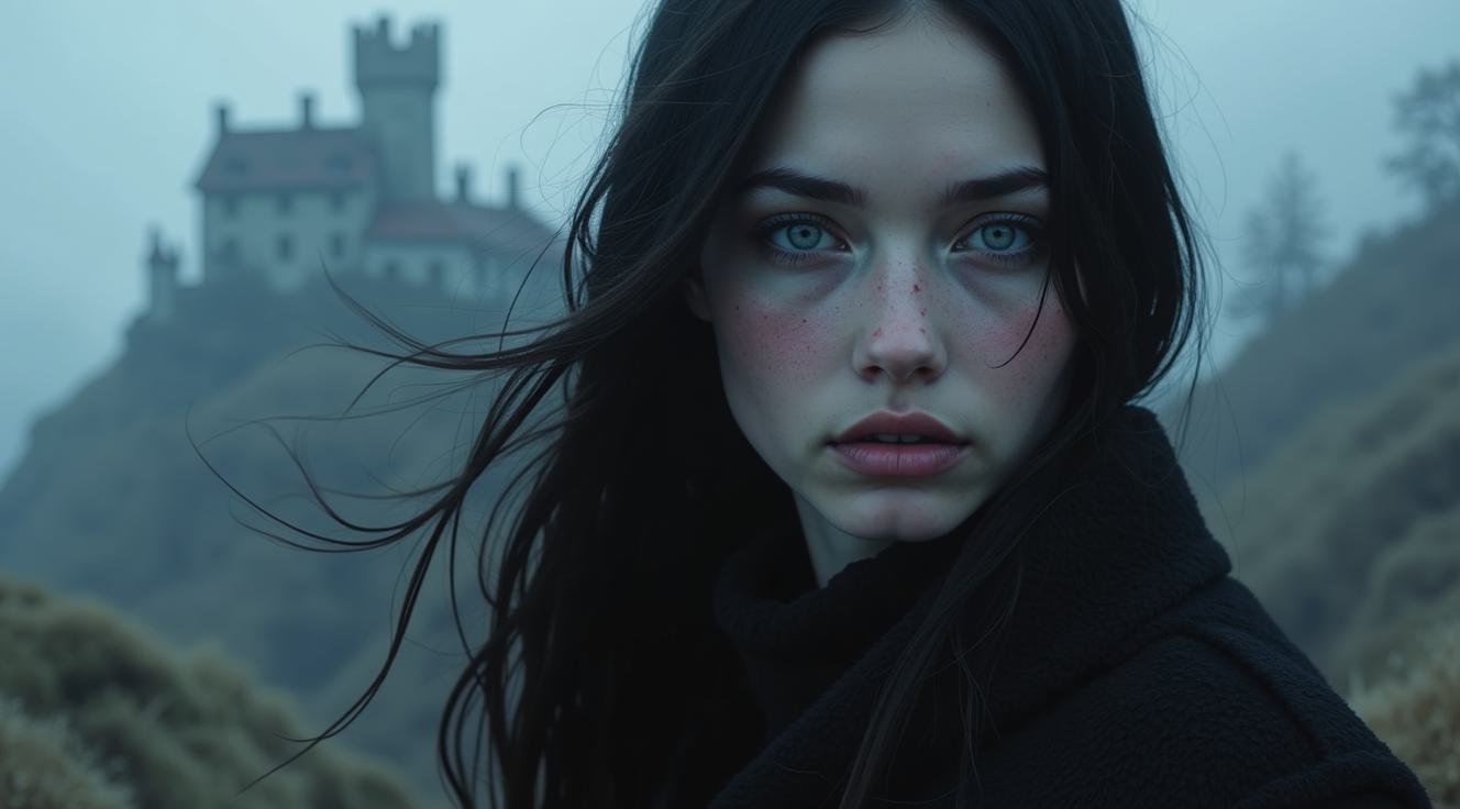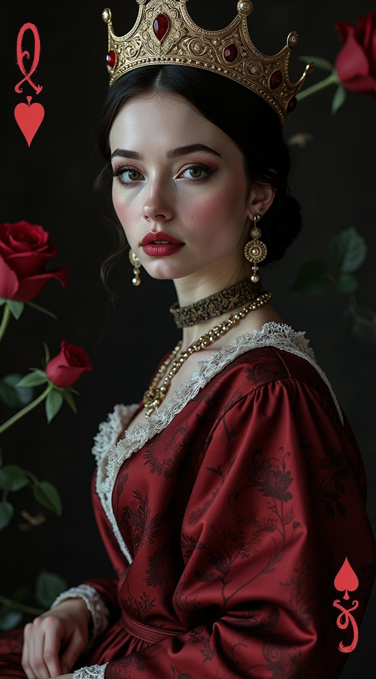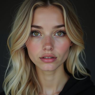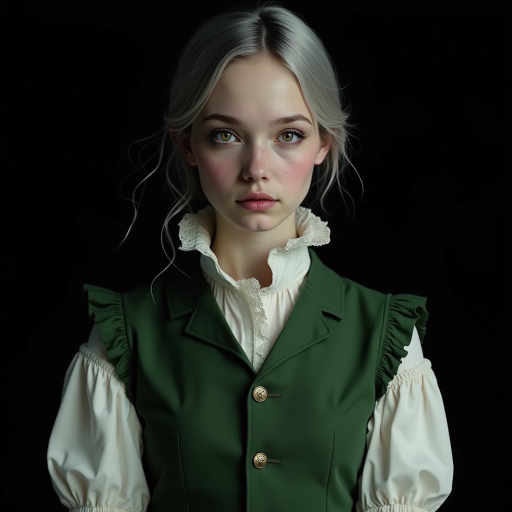 На изображении представлена девушка с блондинистыми волосами, которые слегка волнистые и обрамляют её лицо. У неё светлая кожа и выразительные глаза с длинными ресницами. Губы девушки окрашены в нежный розовый оттенок, что придаёт её образу мягкость и естественность. золотистыми глазами. Она одета в костюм, напоминающий средневековый или ренессансный стиль, с бордовым жилетом и чёрной блузкой с кружевными манжетами. Фон темный, что подчеркивает яркость ее образа.