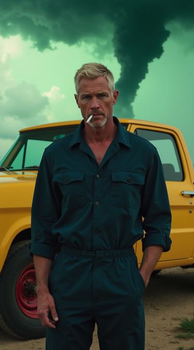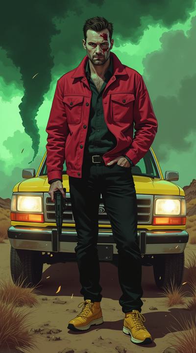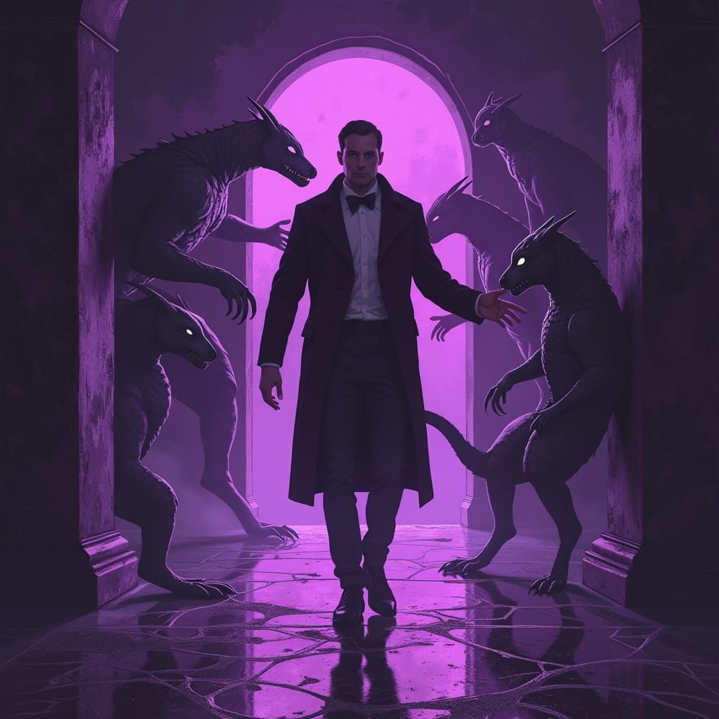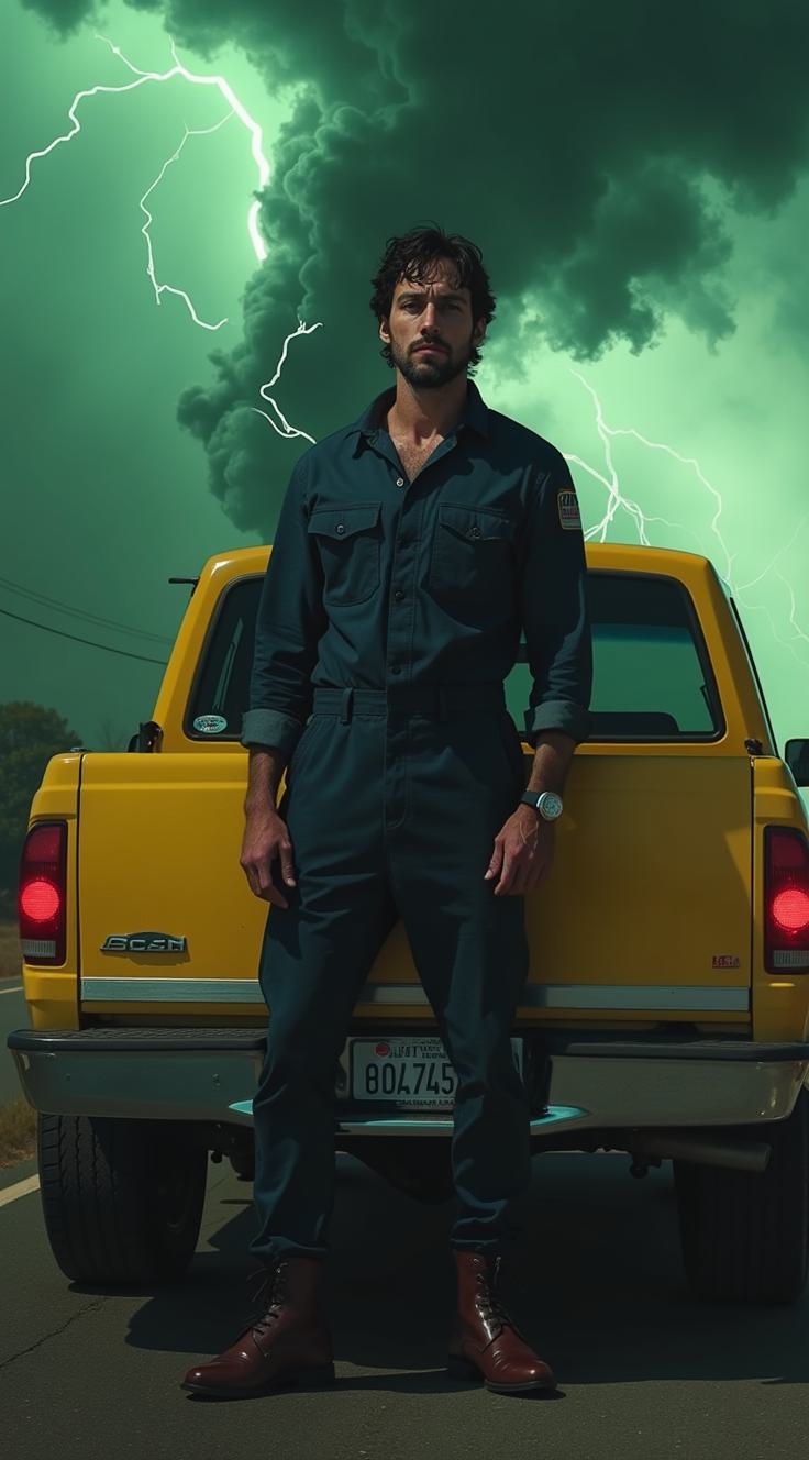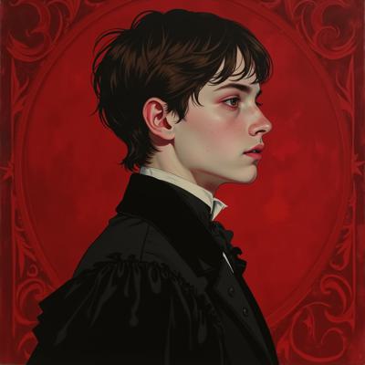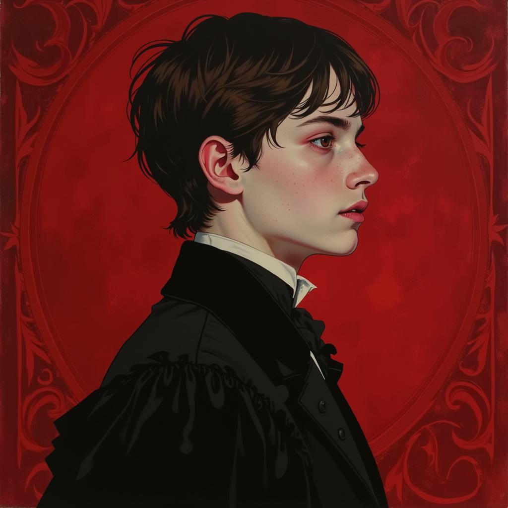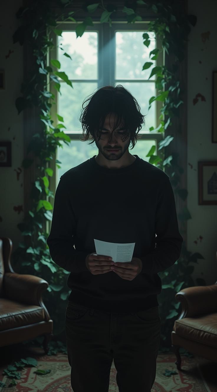 Парень стоит внутри помещения у запотевшего окна старого дома, обвитого густым плющом, с листком бумаги в руках, прижатым к стеклу. Темные растрепанные волосы небрежно падают на лоб, практически полностью закрывая усталые глаза. На нем тёмный свитер. За его спиной — полумрак старой гостиной с облупившимися обоями, пыльными книжными полками.