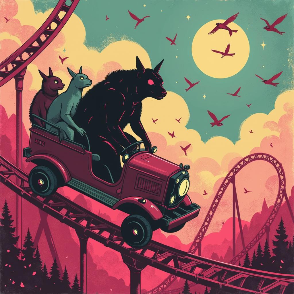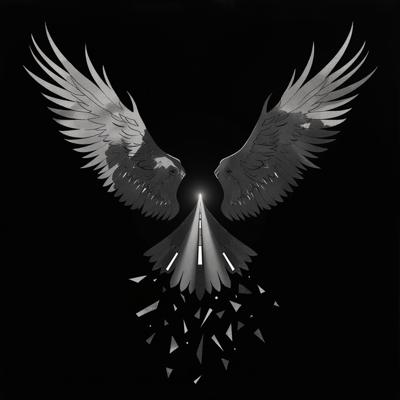 Черный фон. В центре — крыло, но оно не из перьев: каждый "волосок" — тонкий, острый осколок зеркала. В них хаотично отражается серая дорога, уходящая в бесконечность. Второе крыло сломано, его осколки осыпаются вниз, исчезая в темноте. Ни текста, ни лишних деталей. Только свет, отражение и пустота.