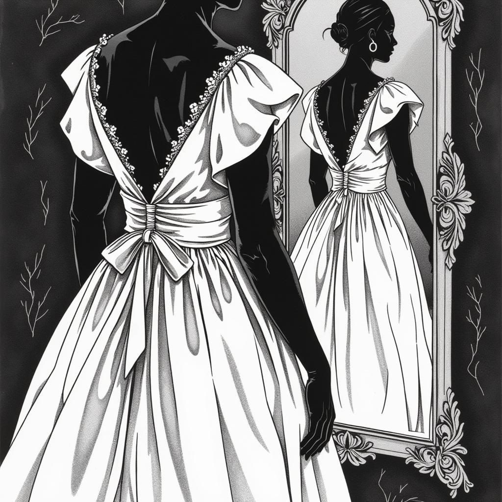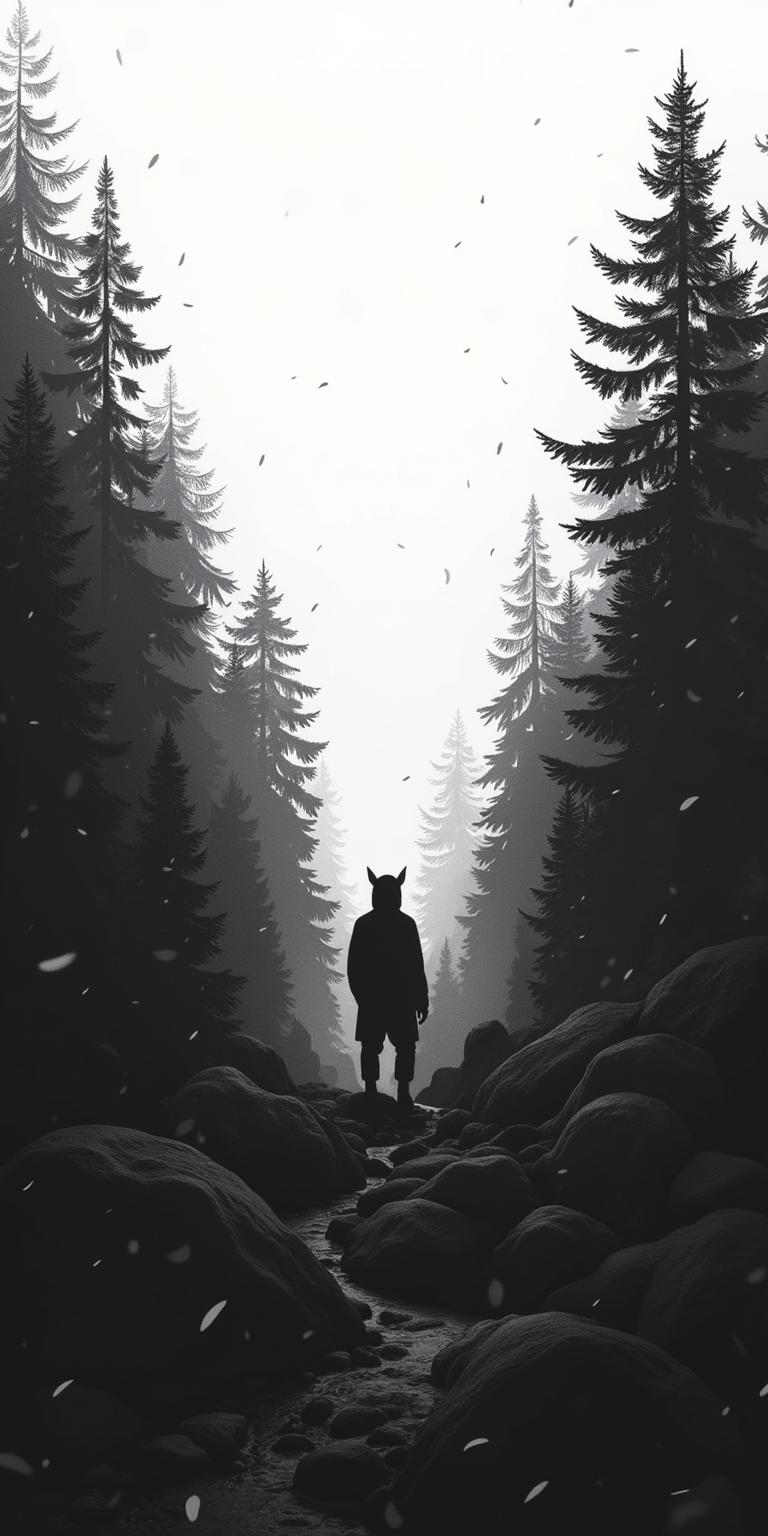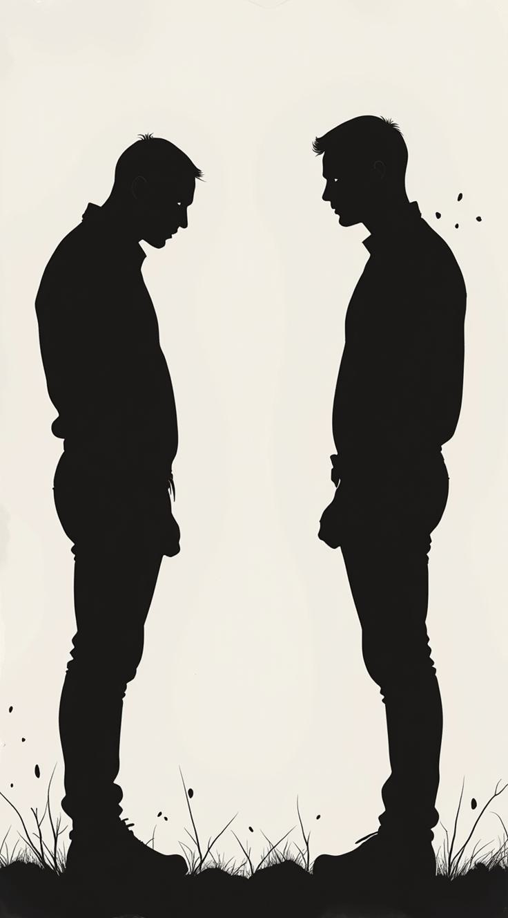 Минималистичная графика, тушь, экстремальный контраст. Два человеческих силуэта стоят друг напротив друга, разделенные широким пустым пространством., Левый силуэт (мужской): Высокий, широкоплечий. Состоит из вертикальной штриховки, как сдерживаемый голод. Слегка наклонен вперед, как будто собирается перейти в наступление., Правый силуэт (женский): Минимально отклонен назад, как будто собирается отступить. Статика оцепенения и отзыва., Пространство между ними: Широкая полоса чистого белого. , Глубокий черный фон. Ни лиц, ни деталей — только форма, поза и ощутимое немое желание.
