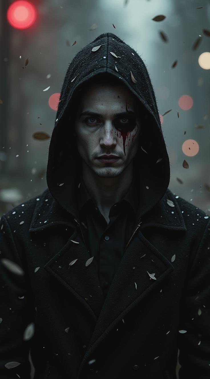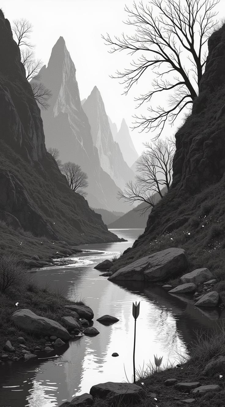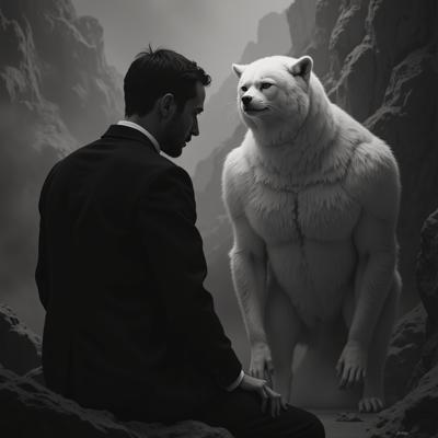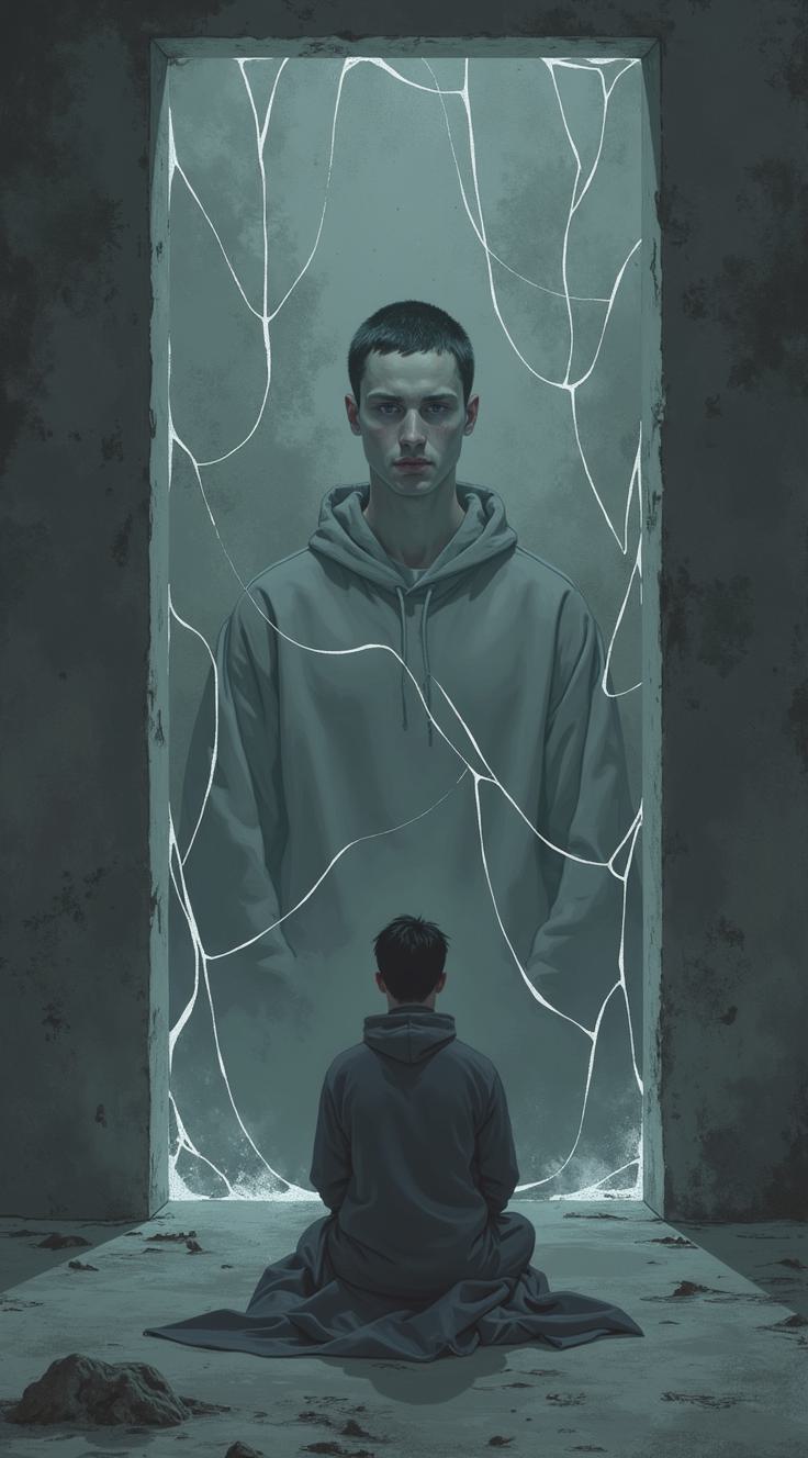 Минималистичная графика, тушь, экстремальный контраст. Два человеческих силуэта стоят друг напротив друга, разделенные широким пустым пространством., Левый силуэт (мужской): Высокий, широкоплечий. Состоит из вертикальной штриховки, как сдерживаемый голод. Слегка наклонен вперед, как будто собирается перейти в наступление., Правый силуэт (женский): Минимально отклонен назад, как будто собирается отступить. Статика оцепенения и отзыва., Пространство между ними: Широкая полоса чистого белого. , Глубокий черный фон. Ни лиц, ни деталей — только форма, поза и ощутимое немое желание.