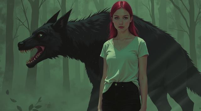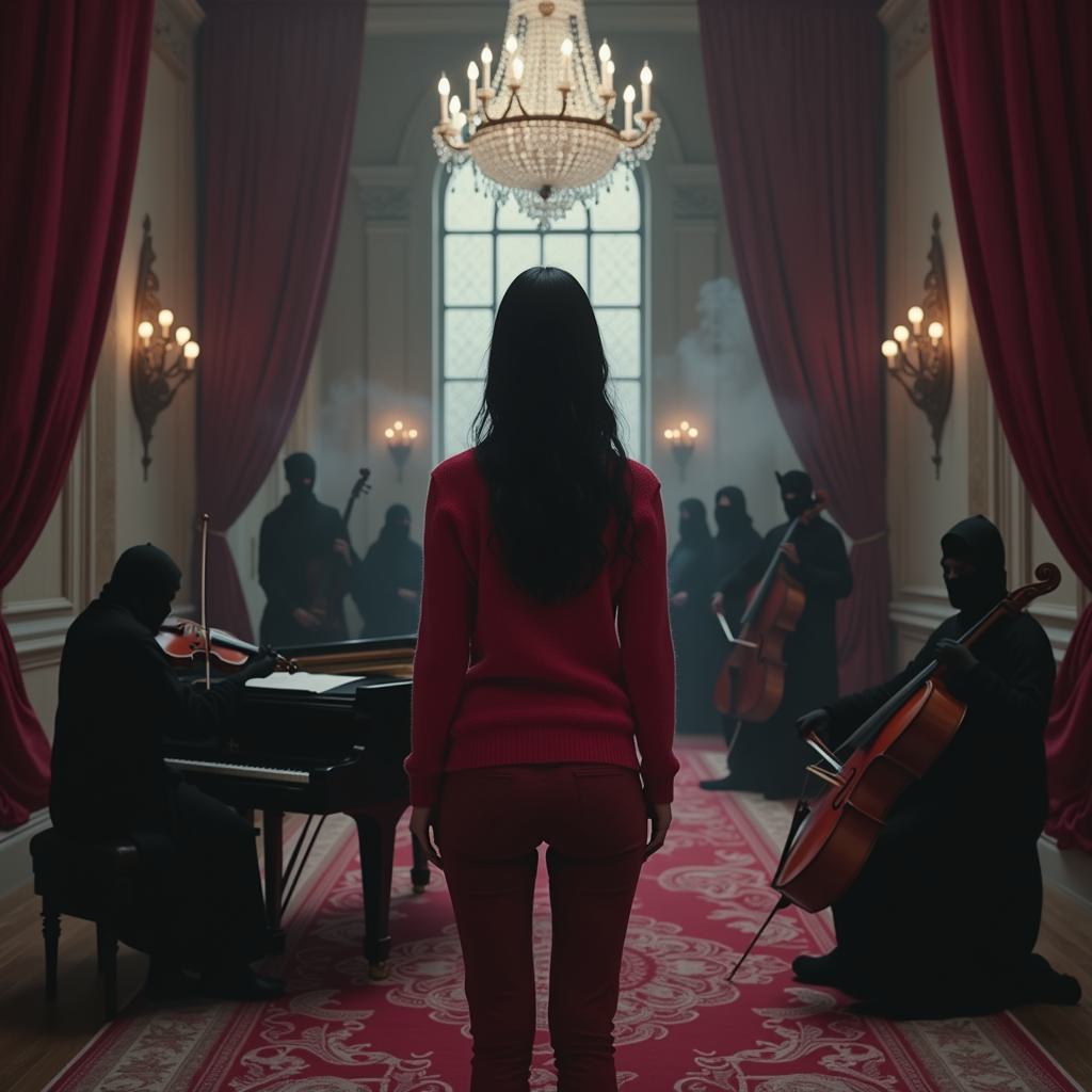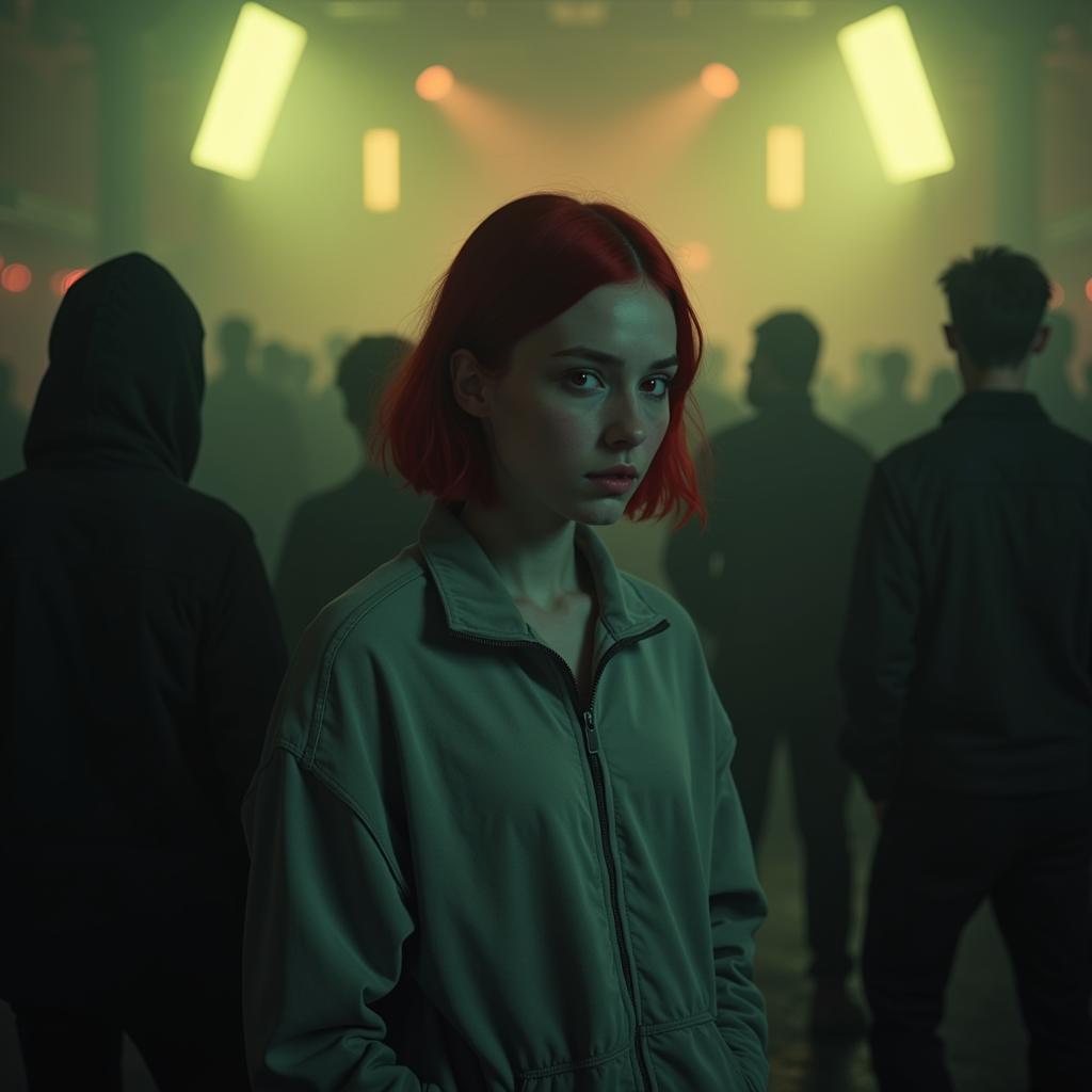 девушка с ярко-алыми волосами чуть ниже плеч и красными глазами, в серо-зеленоватом блеклом спортивном костюме. она стоит посреди монохромного ночного клуба в грязных серых тонах. за спиной мерцают желтые огни. люди вокруг размытые и серые, безликие силуэты. кинематографичное освещение, высокий контраст, ощущение изоляции и подавленного гнева