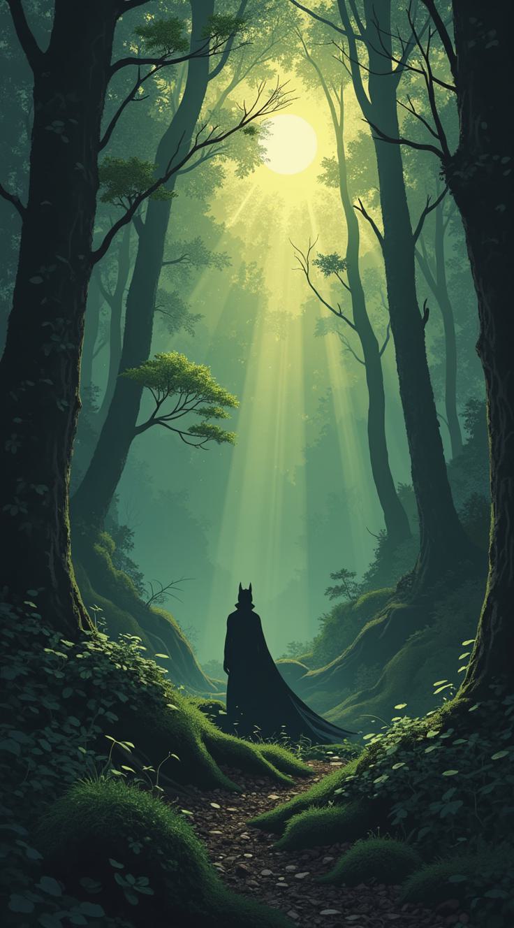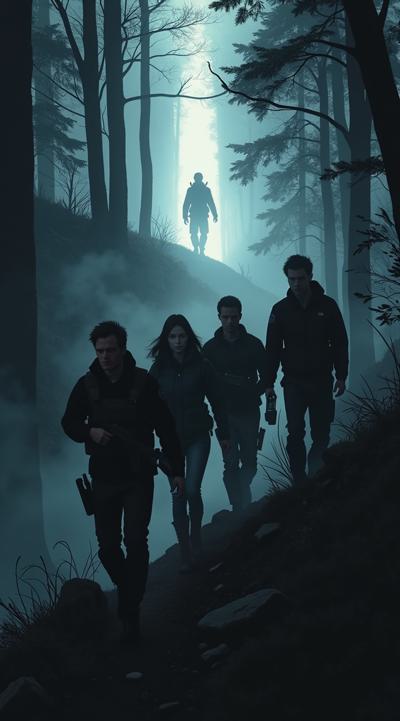 Обложка триллера. Группа людей в тактической одежде (один — мужчина с лицом, полным решимости, женщина с прибором в руках) осторожно движется по краю тёмного леса. Они смотрят на зловещее белое сияние, пробивающееся сквозь деревья. На их лицах — смесь страха и сосредоточенности. Стиль: кинематографичный, драматичное освещение, тёмные тона с акцентом на холодный белый свет.