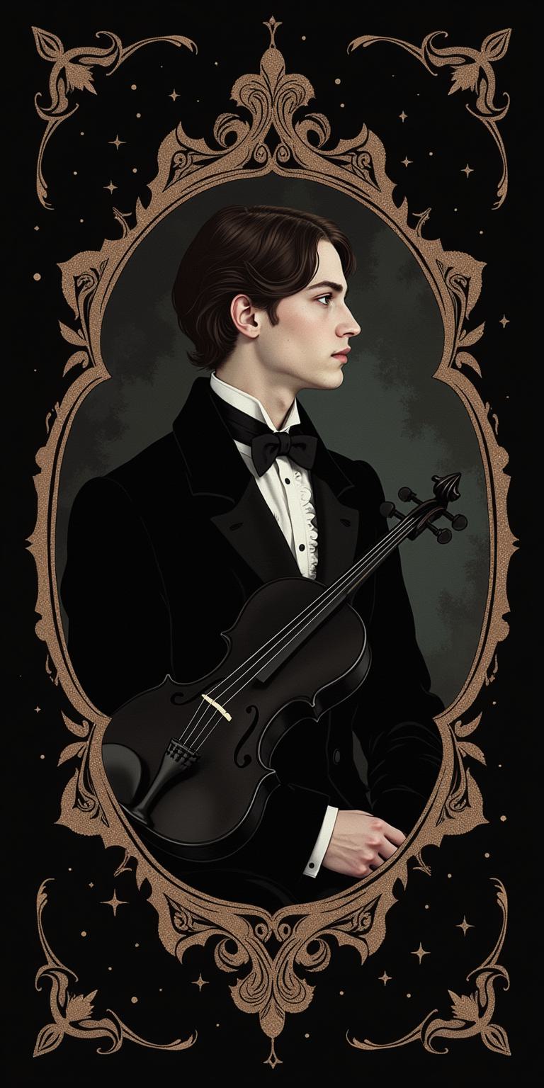 Обложка для книги в стиле готика, темный фон с мелким ажурным узором, посредине ажурная металлическая рамка контур в форме скрипки, внутри рамки фото парня в профиль с бледной кожей карими глазами каштановыми волосами ниже ушей в старинном черном костюме с жабо, держит в руке черную скрипку со светящимися оранжевыми прожилками, Дарк фэнтези, очень детализировано, 4k