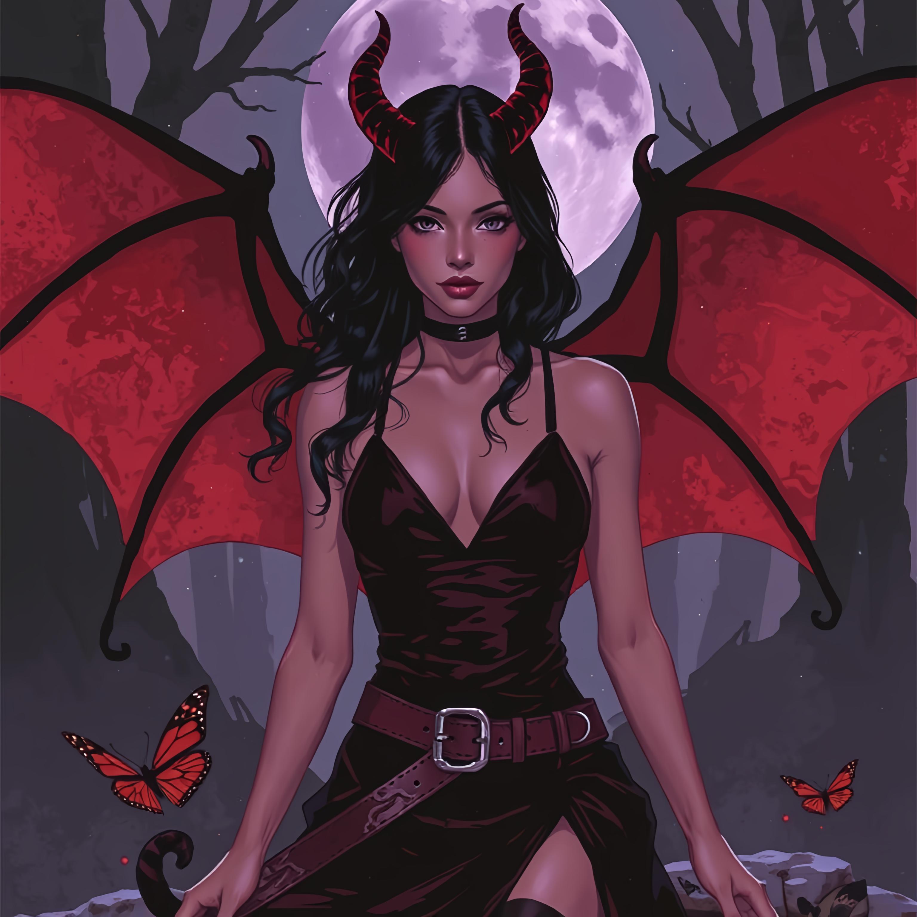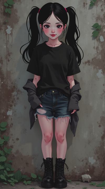 Аниме стиль; красивая девушка-вампирша; чёрные волосы; косички; мертвенно-бледная кожа; веснушки; европеоидная внешность; оражневая светящая радужка глаз; чёрные склеры глаз; довольный вид; улыбается; современнная летняя одежда (чёрная майка, чёрные джинсовые шорты, чёрные армейские ботинки, чёрные гольфы); стоит, слегка расставив ноги, руки на бёдрах; ночное время; свет ночного фонаря; бетонный переулок; здания хайтек; 8k