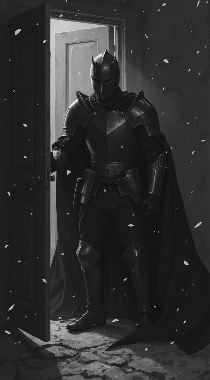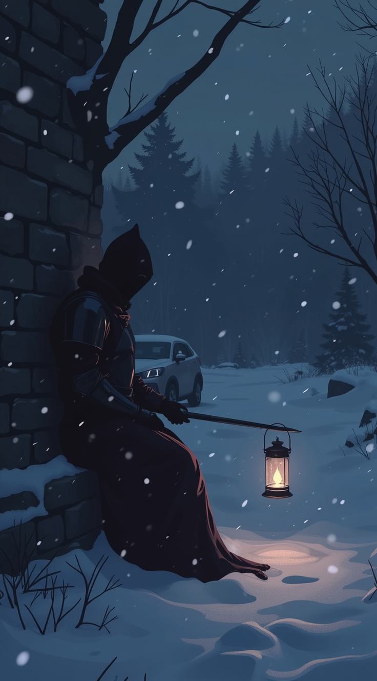 Не все желания должны сбываться. Некоторые просто помогают дожить до утра. Dark fantasy, knight, snow, happy new year, Knight resting against stone wall at night, snowstorm outside, faint lantern light, closed eyes, quiet survival mood, medieval fantasy, anime style, soft shadows, melancholic atmosphere, high detail