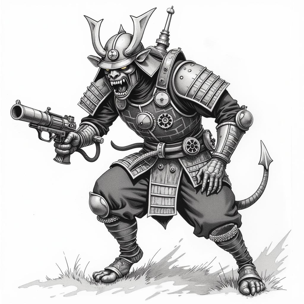 Pencil drawing, steampunk style, a samurai warrior in heavy lamellar armor, horned kabuto helmet with a demon mask (menpo), holding a handheld Gatling gun with gears and steam pipes. Dynamic threatening pose, leaning forward, looming over the viewer, low angle shot, extreme close-up, about to pounce on you. Detailed pencil hatching and shading, white background, high contrast, black and white, no color, sketch texture. --no color paint, watercolor, pastel