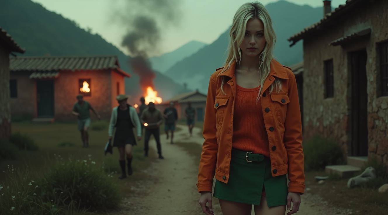 девушка Эшли Грэм блондинка из игры Resident Evil 4 одета в зеленую мини юбку, оранжевый джемпер и оранжевый пиджак, в испанской деревне, очень далеко на горизонте еле различимая толпа жителей одетых в деревенские костюмы с вилами факелами и топорами, один дом горит. мрачная атмосфера . реализм компьютерная графика