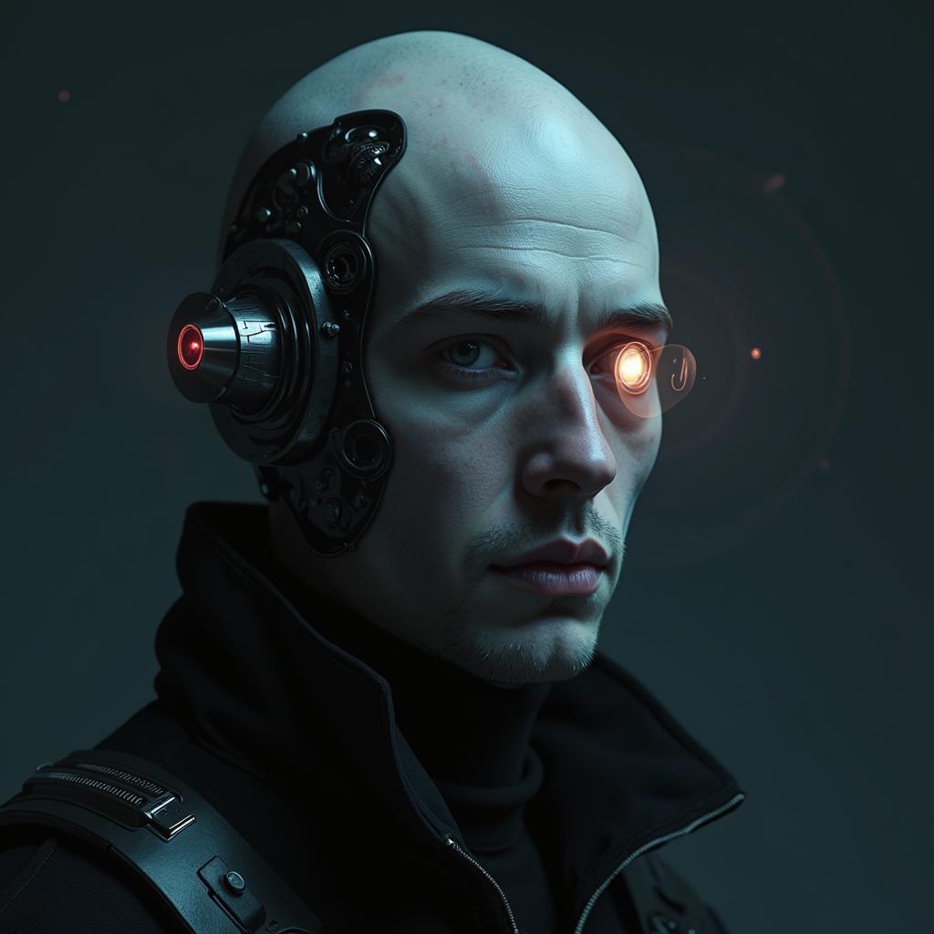 Тема: Cyberpunk далекого будущего 2177 год. Стилистика игры Observer и Time Zero. Атмосфера мрачная,цветовая гамма холодная. Портрет лысого мужчины в возрасте 35 лет. В большую часть его головы вживлен металлический имплант на месте глаза светящийся окуляр. На затылке также виднеется металлический имплант с трубками. Находится в подвально-бункерном помещении свет тусклый, одет в черный кожаный плащ. Он хакер