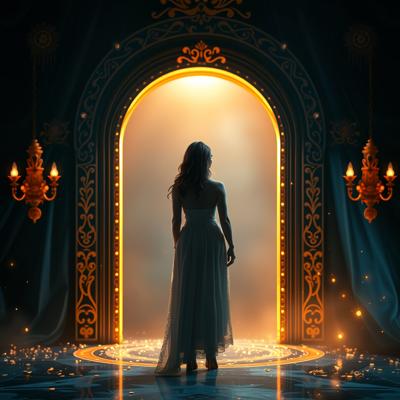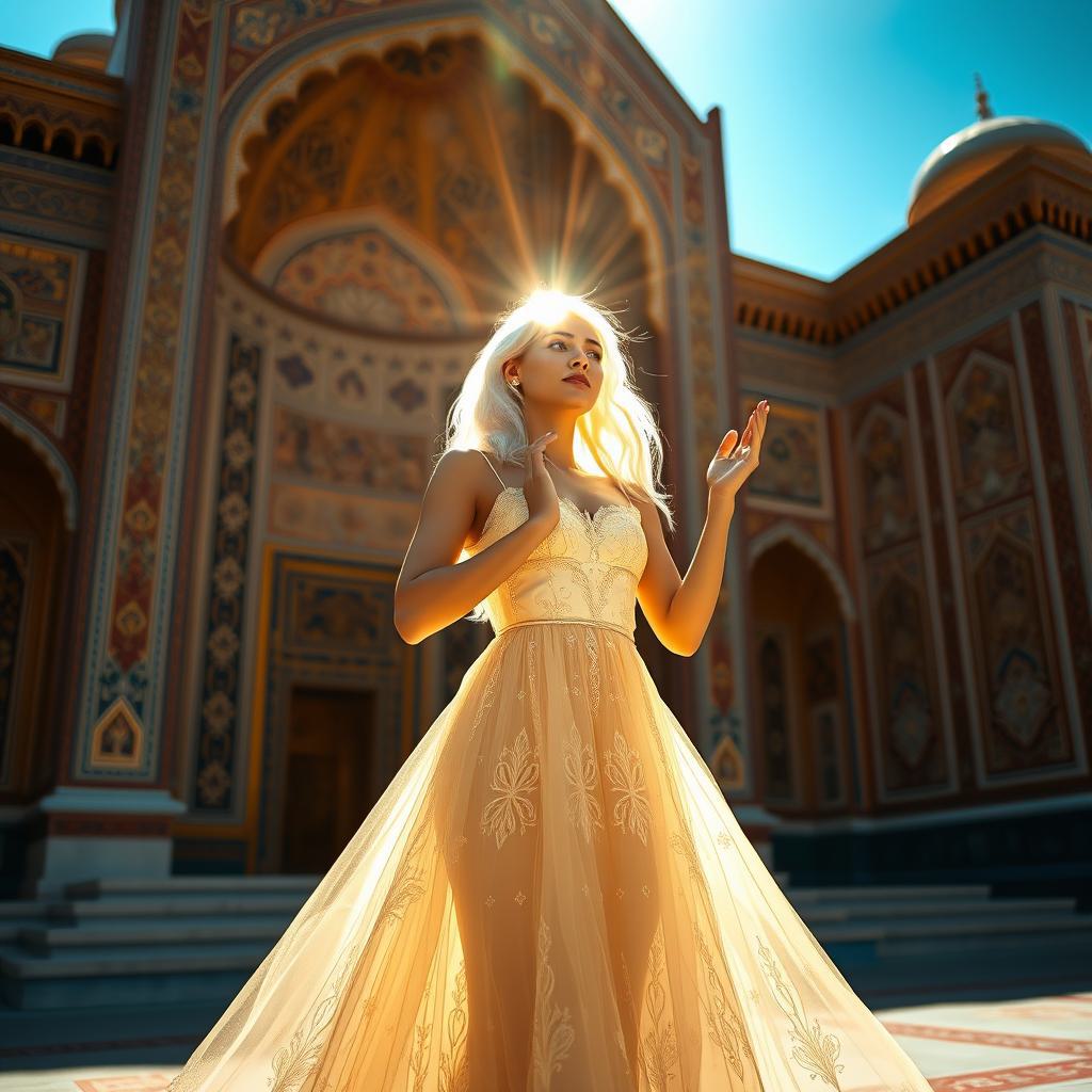 Девушка с белыми волосами, в светящемся платье, вся она сама светится, золотые тона, прозрачное тело, на фоне таджикского золотого расписного в узорах храма в солнце и гор вдали, руки в молитве, вокруг золотая энергия, светлое выражение лица, на голове маленькая диадема, в динамике, обложка к музыкальному альбому, сюрреализм