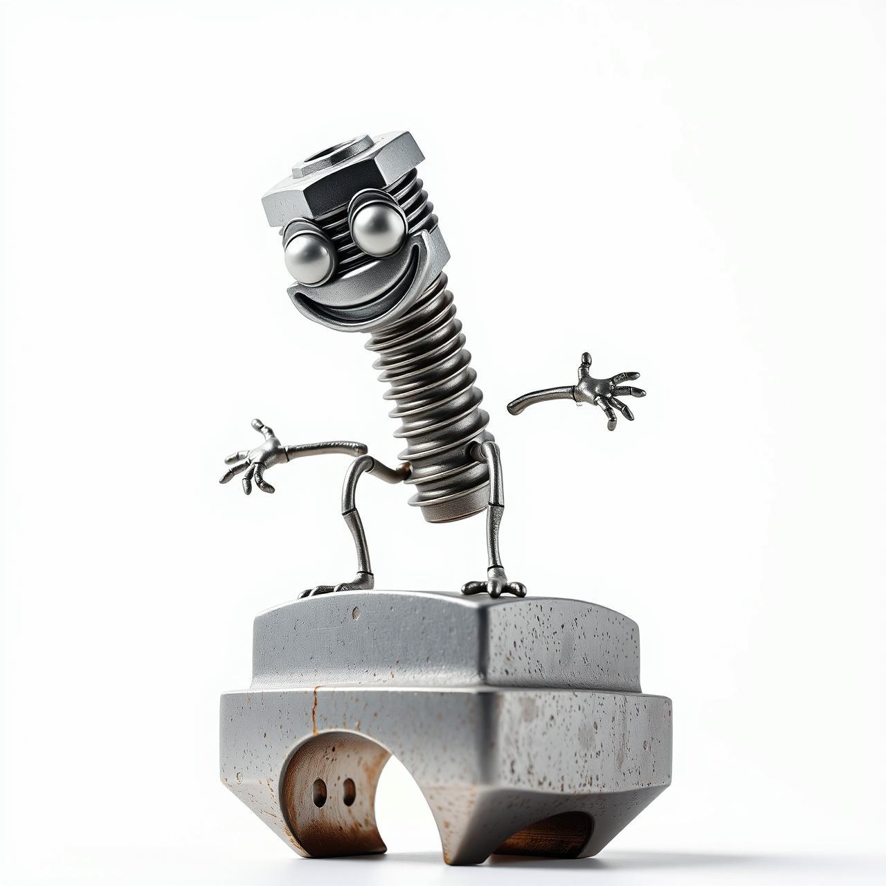 White background. A realistic steel bolt with a thread and a cap sits on a large steel nut, dangling its legs and leaning on its arms. Bolt has hands, mischievous eyes, and a kind smile. Next to the large nut on which the anthropomorphic bolt sits are ordinary small nuts, screws, bolts, screws (there are a small number of them). The lighting highlights the metallic texture, creating a polished and glossy effect. Glare is possible.