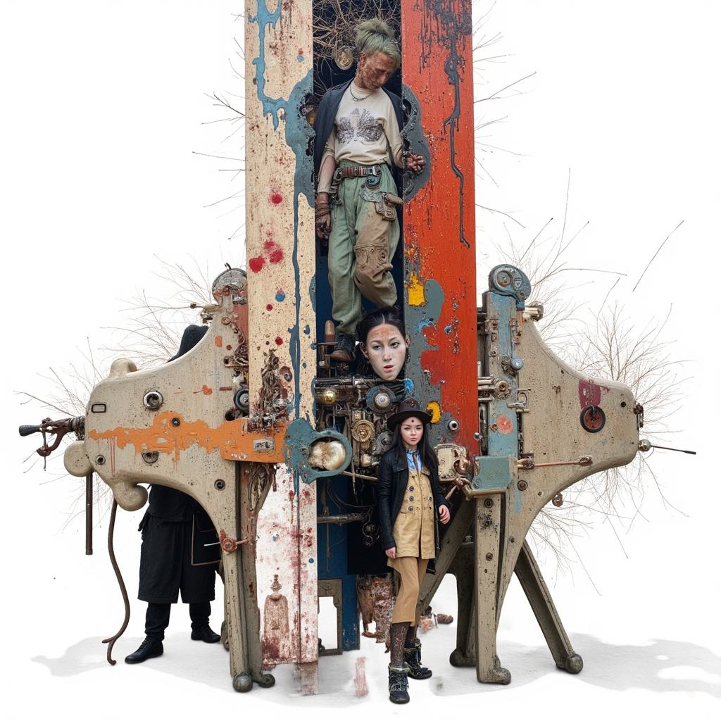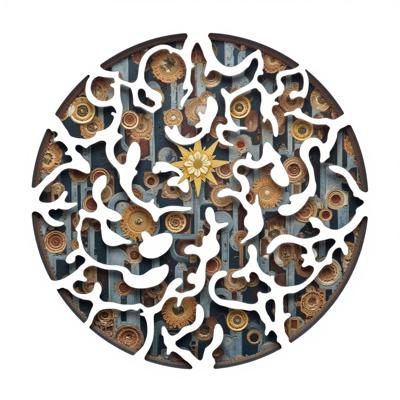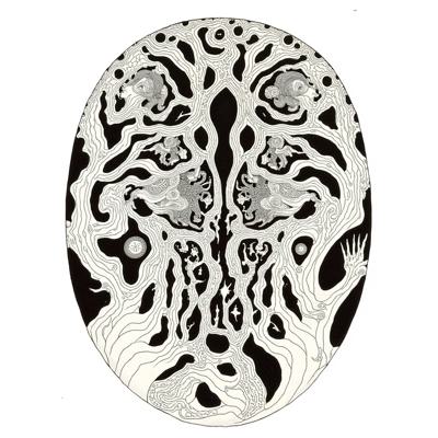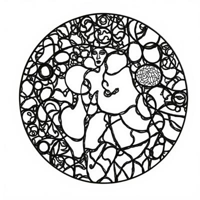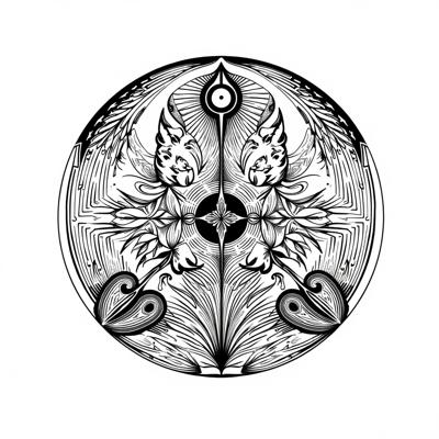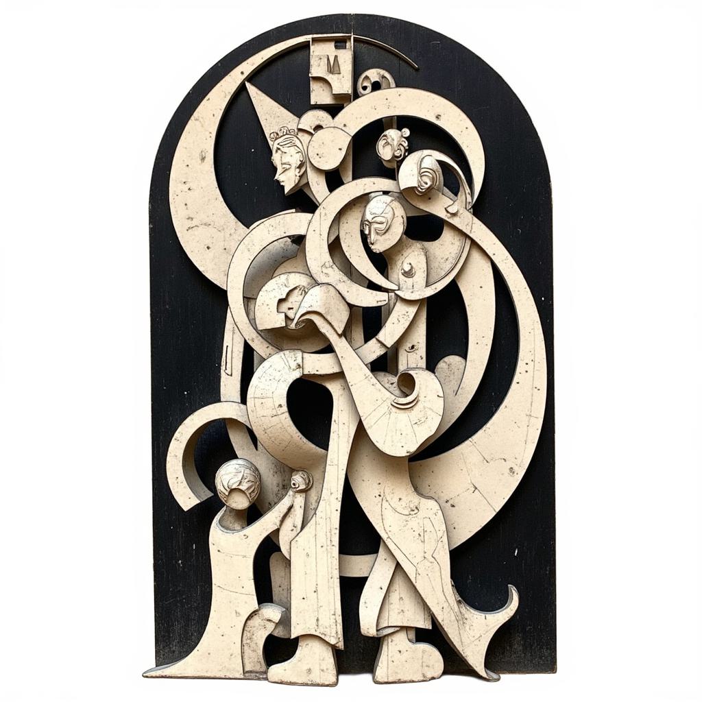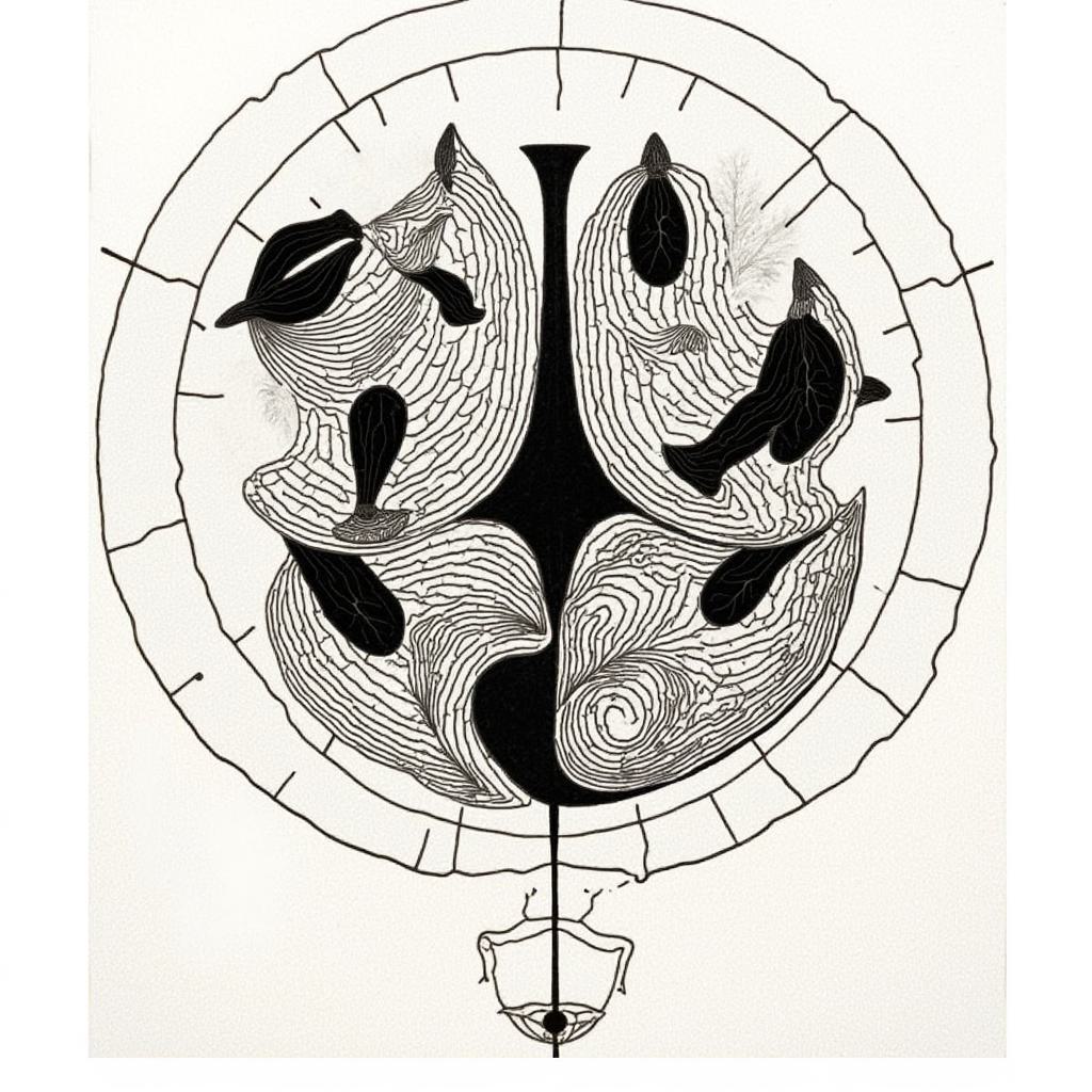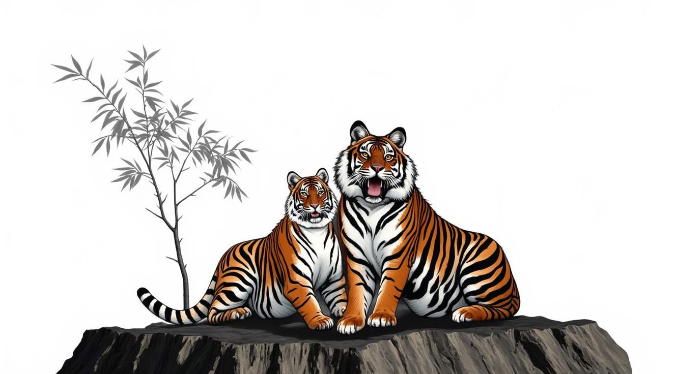 , Силуэтная ЧЕРНО -БЕЛАЯ графика. Арабеска. В представленном картине наблюдается сочетание элементов сюрреализма, абстрактного импрессионизма и минимализма. Композиция включает образ двух тигров в бодрой позе , расположенного на фрагменте утёса, на фоне ветки бамбуковых зарослей , палитра ограничена и выдержана в чёрных, серых, светло-коричневых и охровых тонах, что подчёркивает сдержанность и лаконичность стиля, характерного для минимализма, при этом сохраняя эмоциональную глубину и загадочность, присущие сюрреализму и абстрактному импрессионизму.