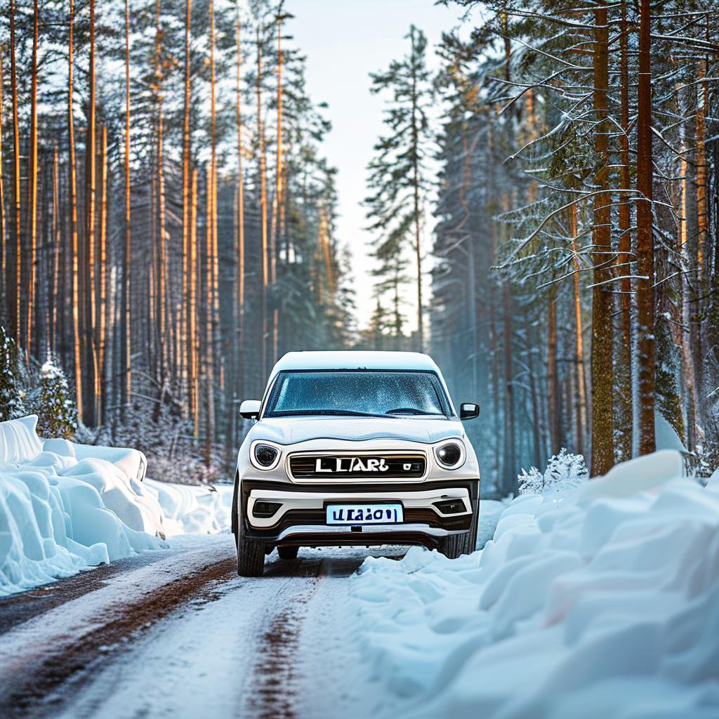 По центру полотна изображён автомобиль lada largus в кузове универсал белого цвета, движущийся справа налево., Машина плавно преодолевает укатанный снег на лесной дороге., Справа от дороги находится залив, покрытый льдом и слегка припорошенный свежим снегом., Слева и впереди автомобиля стоят стройные высокие сосны, ветви которых покрыты пушистым снегом., Небо ясное, голубое, сквозь лёгкую дымку сияет зимнее солнце, отбрасывая мягкие тени и придавая сцене тёплые оттенки.,