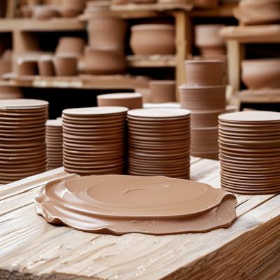 Глина: Центр композиции занимает кусок влажной глины естественного цвета, лежащий на деревянной поверхности. Стеки: Рядом аккуратно разложены металлические и деревянные стеки различной формы, используемые для обработки глины. Их гладкая поверхность контрастирует с шероховатостью глины, создавая гармонию форм и фактур. Краски: Небольшие баночки с красками пастельных оттенков расставлены вокруг. Кисти: Несколько кисточек разной толщины лежат рядом. Фон выполнен в мягких бежевых и серых тонах