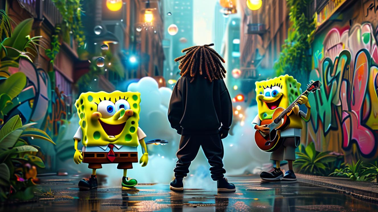 реалистичный нуар. три персонажа в кадре. Яркая уличная сцена: на переднем плане спиной к зрителям стоит рэпер в черной одежде. рядом Губка Боб с широкой улыбкой и регги-музыкант боб марли с дредами и гитарой. Фон — яркое граффити, дымовые пузыри, зелень и городские огни. Атмосфера спокойная, насыщенная цветами, с элементами свободного духа, символами знания и беззаботности."
