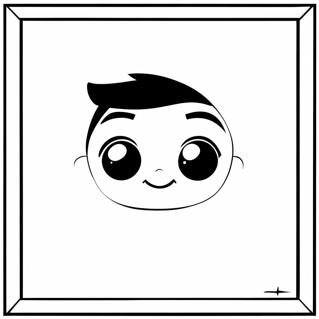 A simple cute cartoon male face inside a thick black square frame., Very large round shiny eyes, small raised eyebrows, and a wide friendly U-shaped smile with a confident hint (slightly heroic)., Clean, smooth, bold outlines., A tiny pencil-like sketch stroke on one side to show it’s drawing-related., Soft colors, minimal details, iconic, readable at small size., No text.