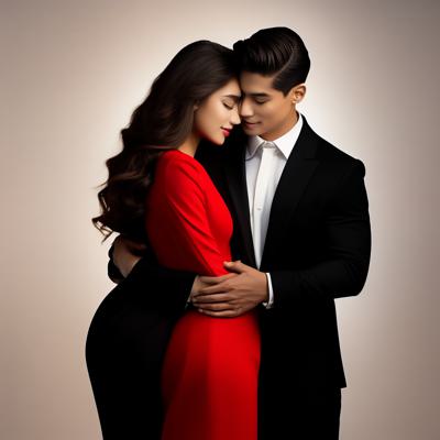 Фон: Выберите нейтральный фон, например, градиент или однотонные цвета, чтобы подчеркнуть пару., , Одежда: Мужчина в классическом черном костюме, женщина в ярком красном платье, чтобы создать контраст., , Поза: Мужчина обнимает женщину со спины, что добавляет интимности и эмоциональной глубины., , Детали: Добавьте текстуры, такие как волосы женщины, складки на платье и костюме, чтобы сделать изображение более реалистичным.