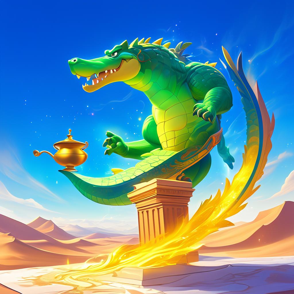 Зелёно‑жёлтый гигантский крокодил‑джинн без ног парит над пустыней под голубым небом. Его нижнюю часть тела заменяет мощный сиреневый магический хвост: он начинается прямо от красного пояса, струится вниз и погружается в носик золотой волшебной лампы, стоящей на мраморной колонне. На крокодиле — золотые браслеты и чёрная жилетка с белой каймой и белыми карманами.