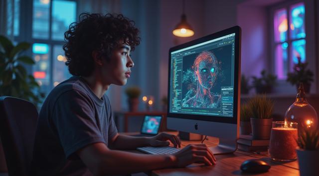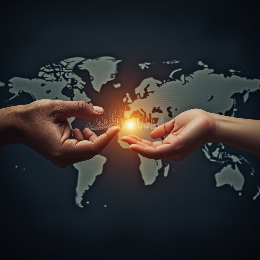 A powerful symbolic image of two hands reaching towards each other - one is a weathered hand of an elderly person, the other is a young hand. Between them, a glowing bridge is formed from streams of binary code and digital icons. The background shows a global map. Style: conceptual digital art, hopeful. -style raw, ,