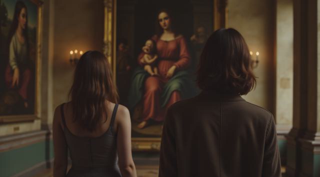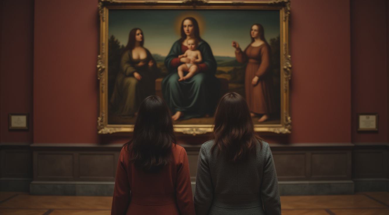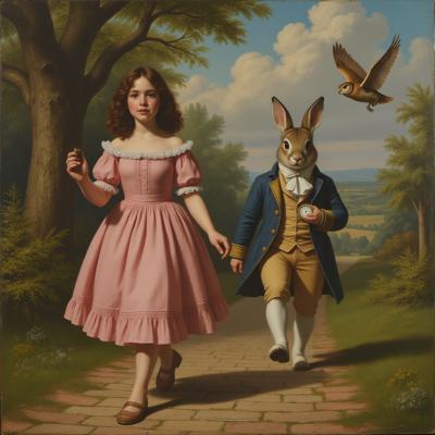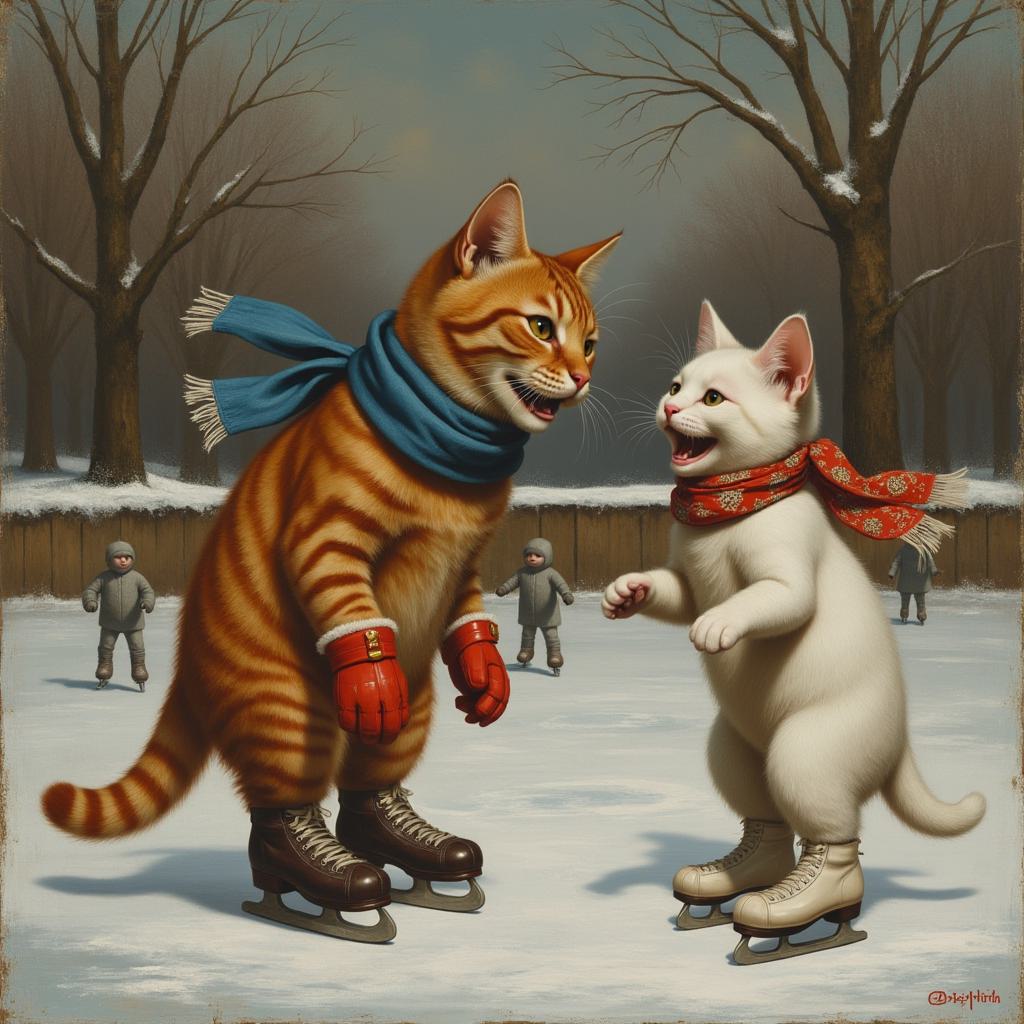 СРЕДНЕВЕКОВАЯ КЛАССИЧЕСКАЯ ЖИВОПИСЬ . РЫЖИЙ ПОЛОСАТЫЙ С СИНИМ ШАРФОМ КОТ ПОДСКОЛЬЗУЛСЯ И УПАЛ НА ТЕМНЫХ КОНЬКАХ И КРАСНЫХ РУКАФИЦАХ НА ЛЬДУ ЗИМОЙ ОТКРЫВ РОТ И ГЛЯДЯ НА БЕЛУЮ СМЕЮЩУЮСЯ КОШКУ ВБЕЛЫХ КОНЬКАХ И КРАСНОМ ЦВЕТОЧНОМ ПЛАТКЕ НА ГОЛОВЕ . РЯДОМ ДВА СЕРЫХ СМЕЮЩИХСЯ КАТЕНКА С ХОКЕЙНЫМИ КЛЮШКАМИ . ФОН ЗИМНЯЯ ПРИРОДА