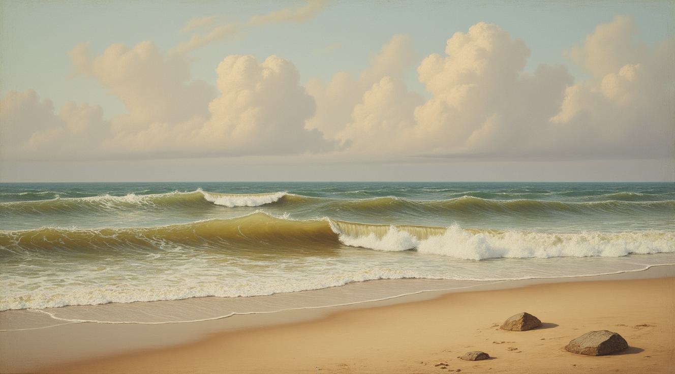 ЖИВОПИСЬ 19 ВЕК . МОРСКОЙ ПЕЙЗАЖ . ВОЛНЫ ЧАСТЫЕ ПО ВЫСОТЕ СРЕДНИЕ С ПЕНОЙ , ПЕНЫ МНОГО И ПЕСЧАНЫЙ БЕРЕГ ЦВЕТ ВОЛН КОРИЧНЕВО - ЗЕЛЕНЫЙ СЕРЫЙ И СИНИЙ . В ОСНОВНОМ НА КАРТИНЕ МОРЕ И НЕМНОГО БЕРЕГА . МОРЕ НА КАРТИНЕ РАСПОЛОЖЕНО АНФАС . НА ПЕСКЕ ПАРА НЕБОЛЬШИХ КАМНЕЙ . ЦВЕТА И ТОНЫ ПАСТЕЛЬНЫЕ ПРИГЛУШЕННЫЕ