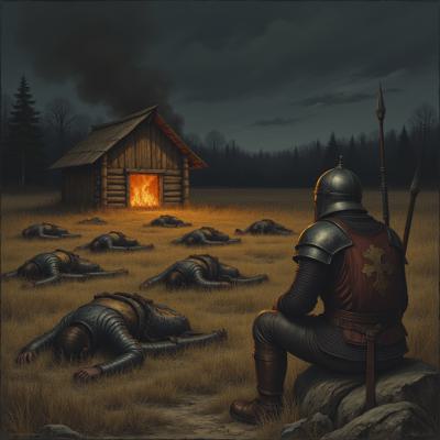 рисунок в тёмных тонах, рисованный стиль, рисунок, арт, ночь, поле сражения, слева деревянная бревенчатая застава, застава, пограничное сооружение, горит, под ней широкое поле, на котором лежат убитые стрелами воины в кольчугах, на переднем плане на земле сидит опустив голову воин в кольчуге, богатырь, спиной, на его поясе пустые ножны, а на земле рядом с ним лежит меч, на фоне лес, луна