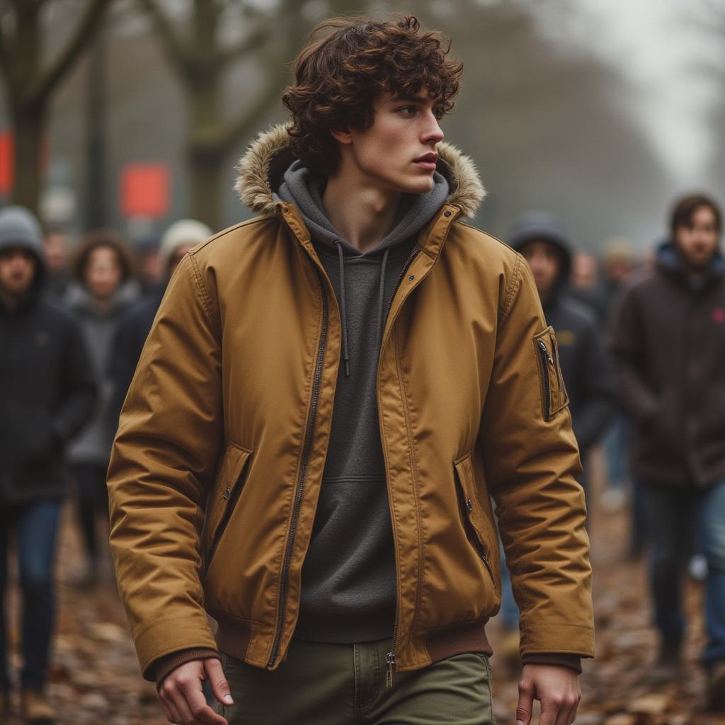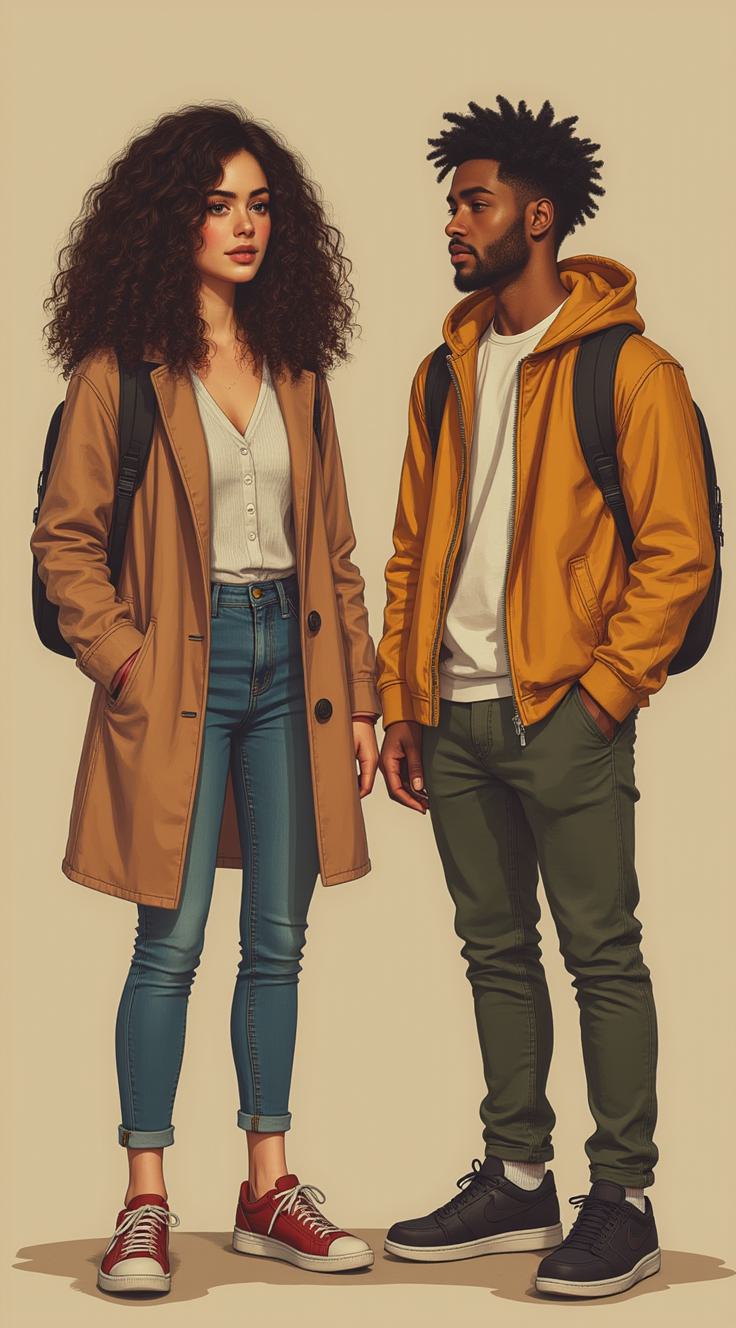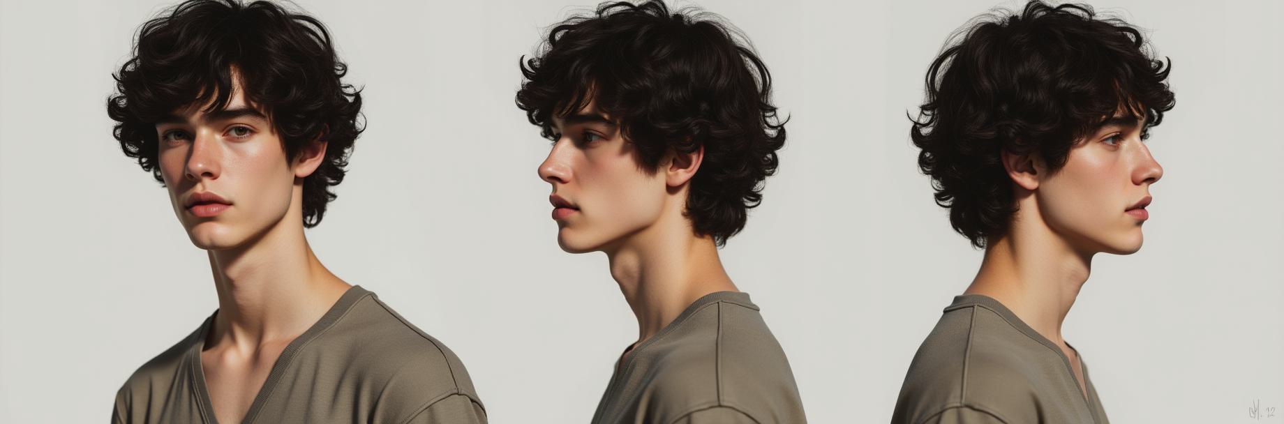 Сгенерируйте изображение высокого молодого человека с бледной кожей. Покажите его в полный рост с трех ракурсов: анфас, вид сбоку и со спины., , Ключевые детали:, * Прическа: Черные волосы средней длины, с вьющимися концами., * Лицо: Серые глаза, слабо выраженные скулы., * Одежда: Свободный свитер с чередующимися черными и красными полосами. Широкие черные карго-штаны с накладными карманами. Массивные черные берцы.