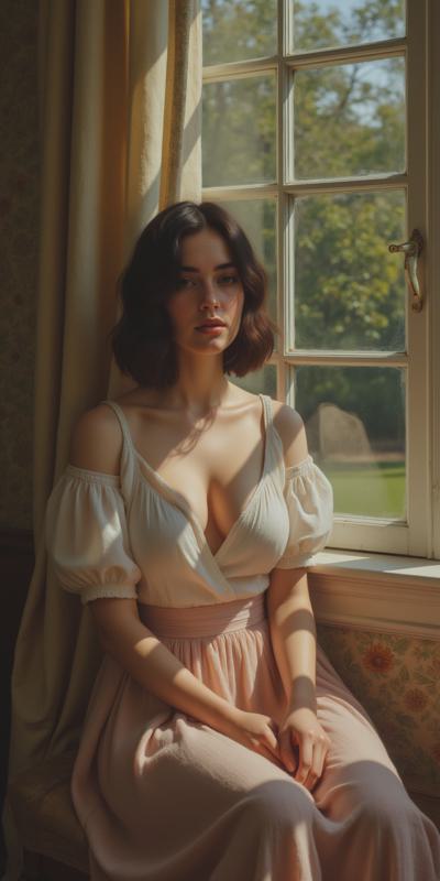 Edward Kukuel's painting style, a very beautiful woman sitting by a large window, soft daylight illuminating her face, a calm thoughtful expression, a smooth transition from the interior to the garden, muted pastel colors, an intimate and calm mood, the texture of oil painting, vertical wallpaper for your phone