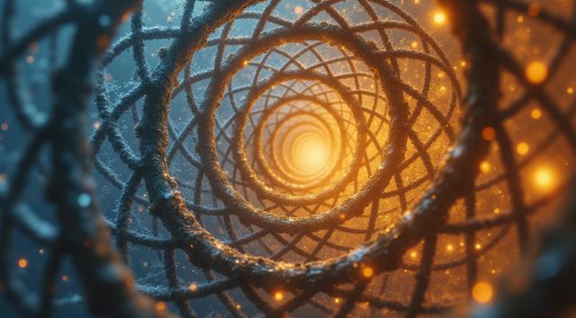 Абстрактная визуализация энтропии как структуры реальности. С одной стороны — идеально упорядоченная, холодная, голубая кристаллическая решетка, распадающаяся на яркое, огненное, динамичное золотое спиральное движение. Золотая спираль образует сложные фрактальные узоры, напоминающие нейронные сети и галактики. В центре — метафизические песочные часы, где песок превращается в звездную пыль. Космический фон, глубокий черный и фиолетовый, кинематографичное освещение