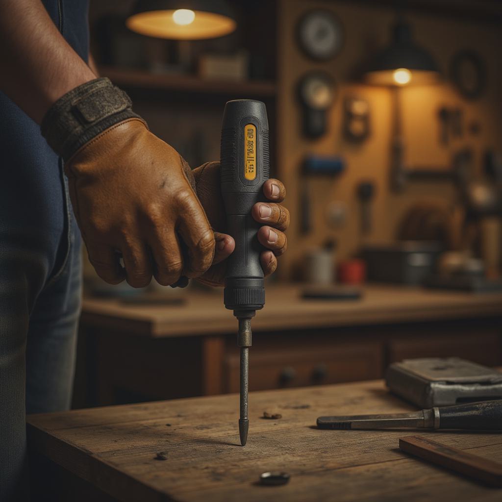 Кинематографичный кадр, крупный план. Мужские натруженные руки в кожаных перчатках держат современный аккумуляторный шуруповерт. На заднем плане — верстак в гараже, аккуратно развешанные на стене ключи, отвертки и измерительные приборы. Мягкий теплый свет от лампы, пылинки в воздухе, высокое разрешение, фотореализм, 8k.,